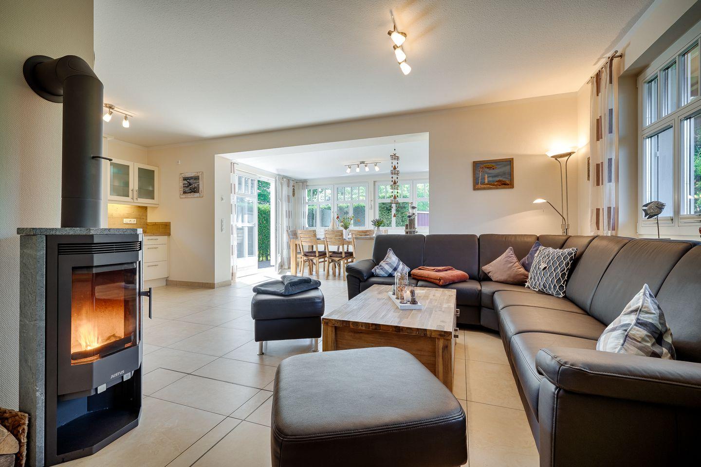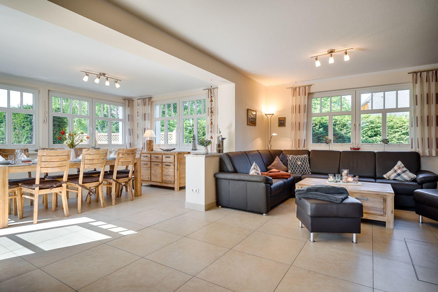 Wohnraum mit Ledercouch, Esstisch für 8 Personen im Wintergarten