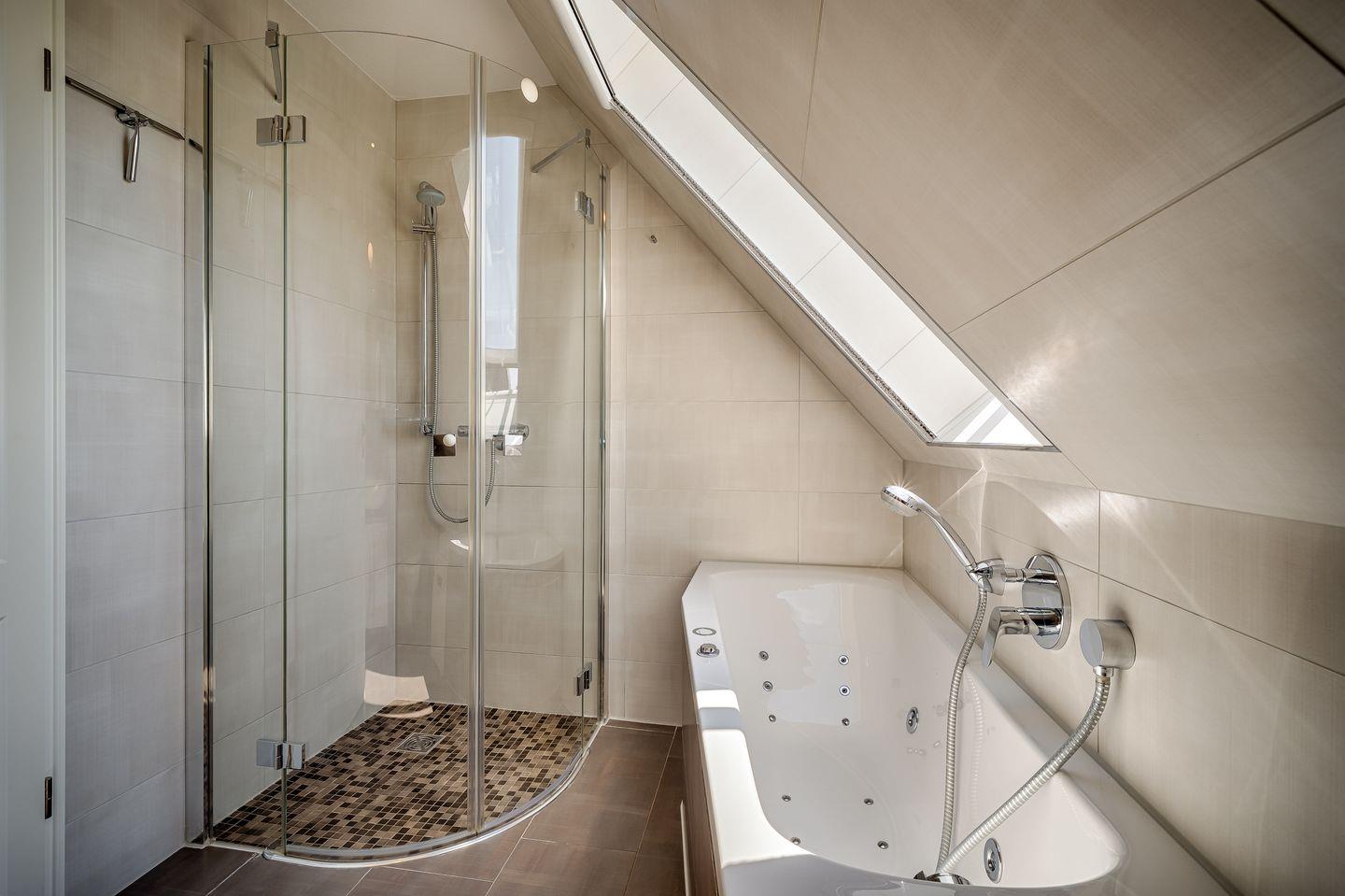 Bad mit ebenerdiger Dusche und WC, anliegender Sauna (ohne Gebühren), Handtuchwärmer, Fön, Kosmetikspiegel