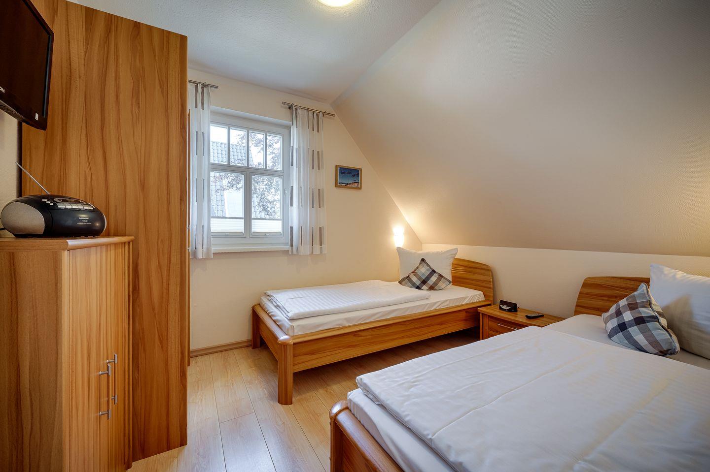 1 Schlafzimmer mit 2 Einzelbetten (0,90x2,00m), Federkernmatratzen, verstellbare Lattenroste, TV