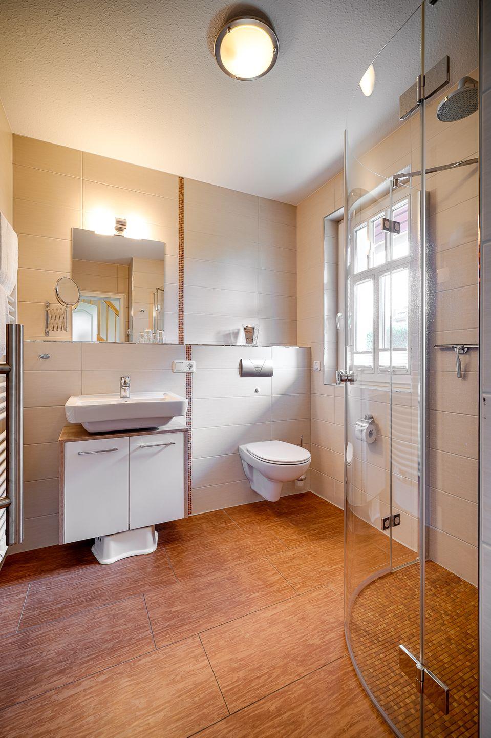 Bad mit ebenerdiger Dusche und WC, Handtuchwärmer, Fön, Kosmetikspiegel