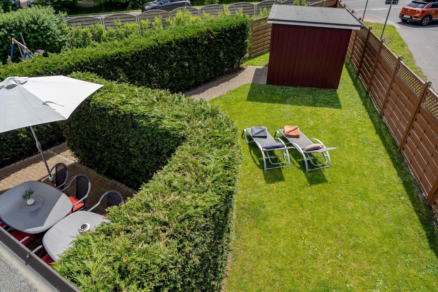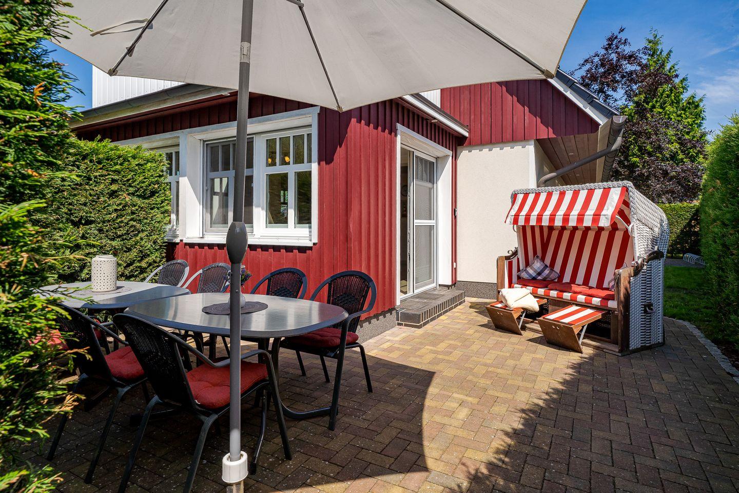 Terrasse mit Gartenmöbel, Sonnenschirm, Holzkohlegrill, Strandkorb (Mai-Oktober)