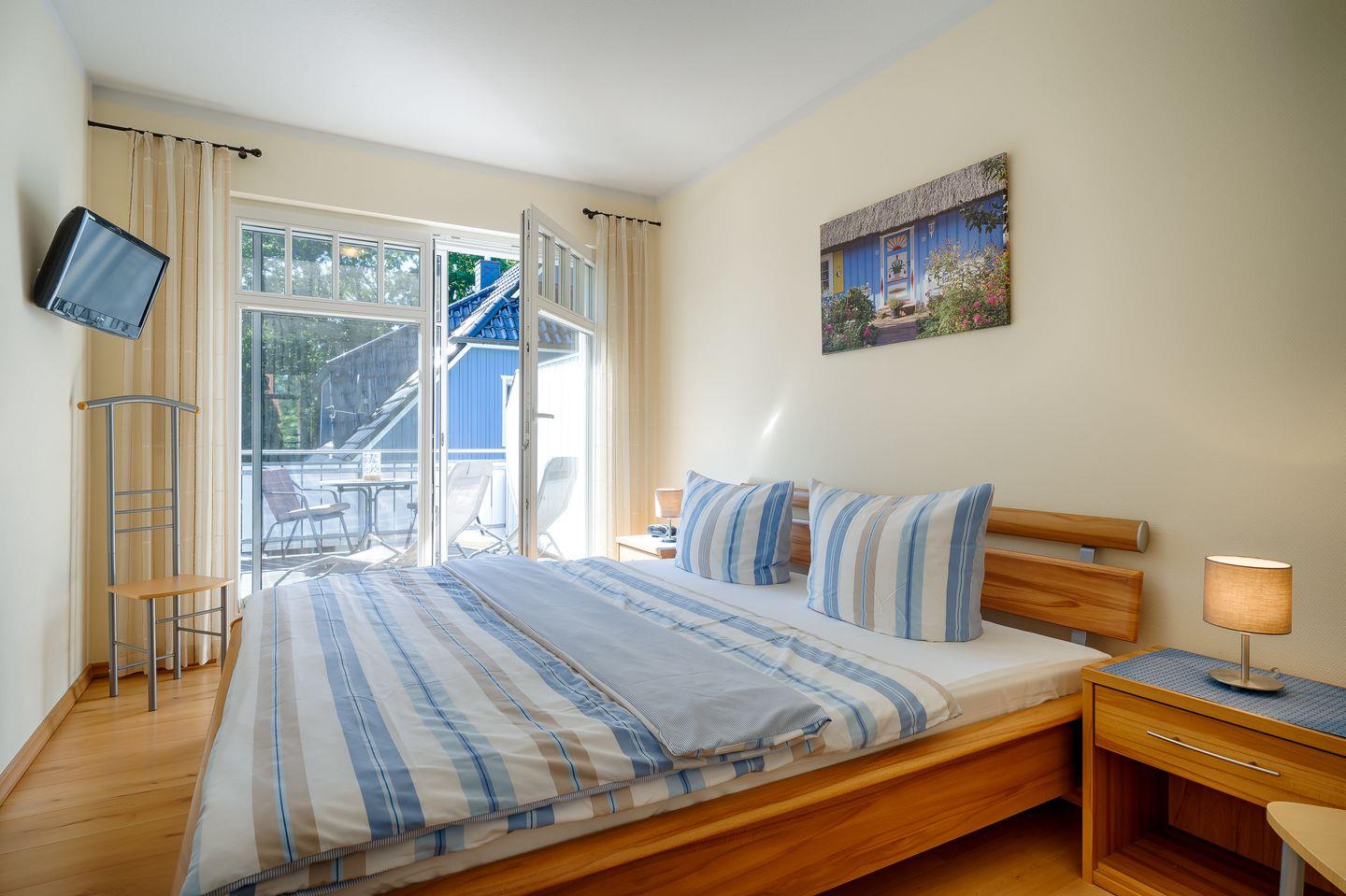 1 Schlafzimmer mit 2 Einzelbetten (0,90x2,00m), TV und Balkon (Osten)