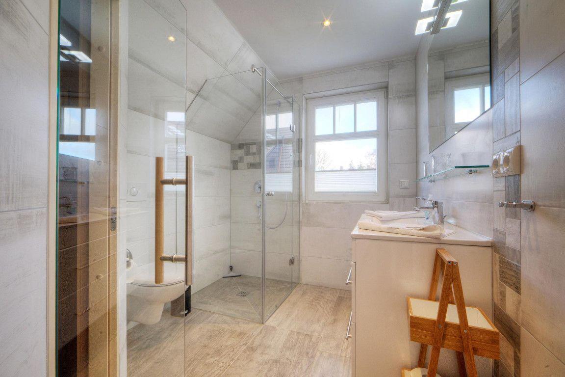 Tageslichtbad mit ebenerdiger Dusche und WC und anliegender Sauna (ohne Gebühren)