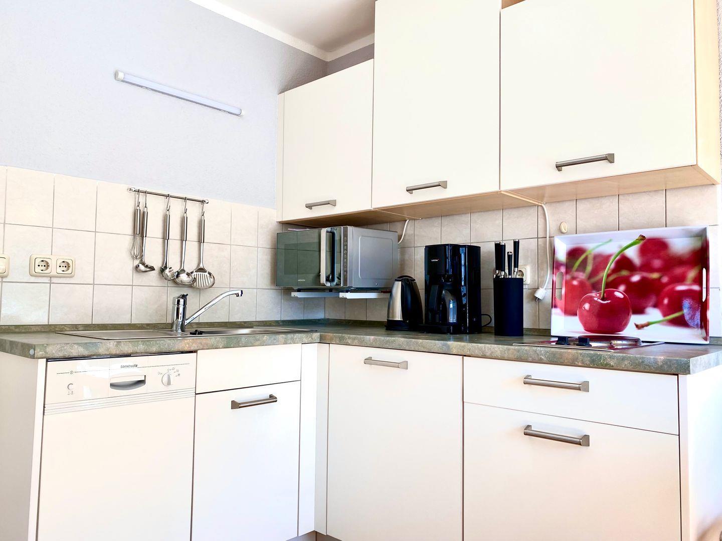 In einem gepflegten Garten befindet sich das Haus Windrose mit der Fewo "Peildeck". Diese ca. 50 qm große Ferienwohnung liegt im Obergeschoss und wird für maximal zwei Erwachsene und ein Kind angeboten. Im Wohnzimmer befinden sich eine integrierte Küche und eine Essecke. Von hier gelangen Sie auf den Balkon, die zur Südseite ausgerichtet ist. Ihnen steht ein Schlafzimmer mit Doppelbett und ein kleines Zimmer mit einer Liege zur Verfügung. Das Bad hat ein Fenster und ist mit einer neuen Glasdusche und WC sowie Handtuchtrockner ausgestattet. In der Küche befindet sich eine Mikrowelle mit Grill und Backfunktion. In der Fewo ist in jedem Zimmer mindestens ein Fenster mit Fliegengitter vorhanden.