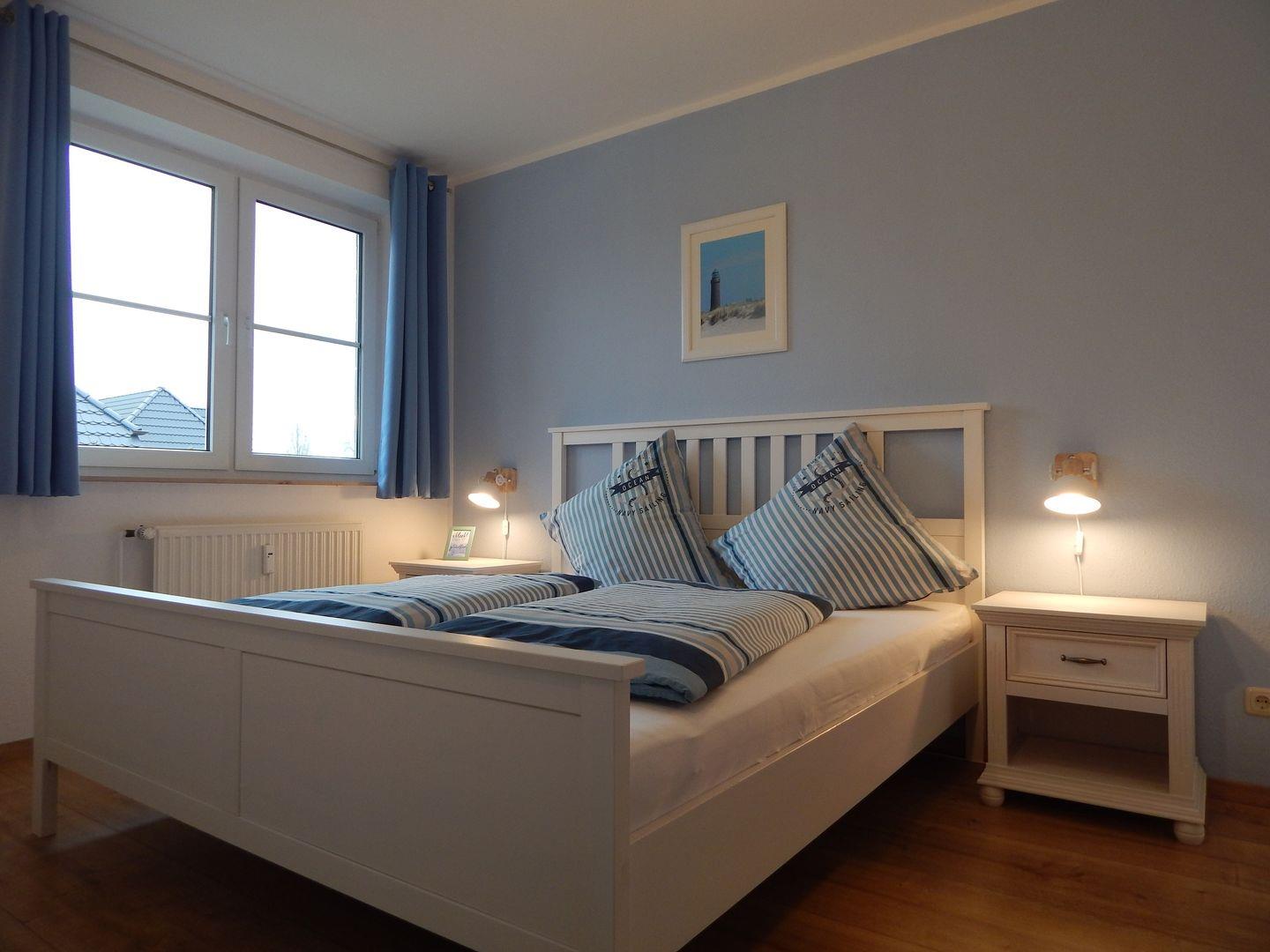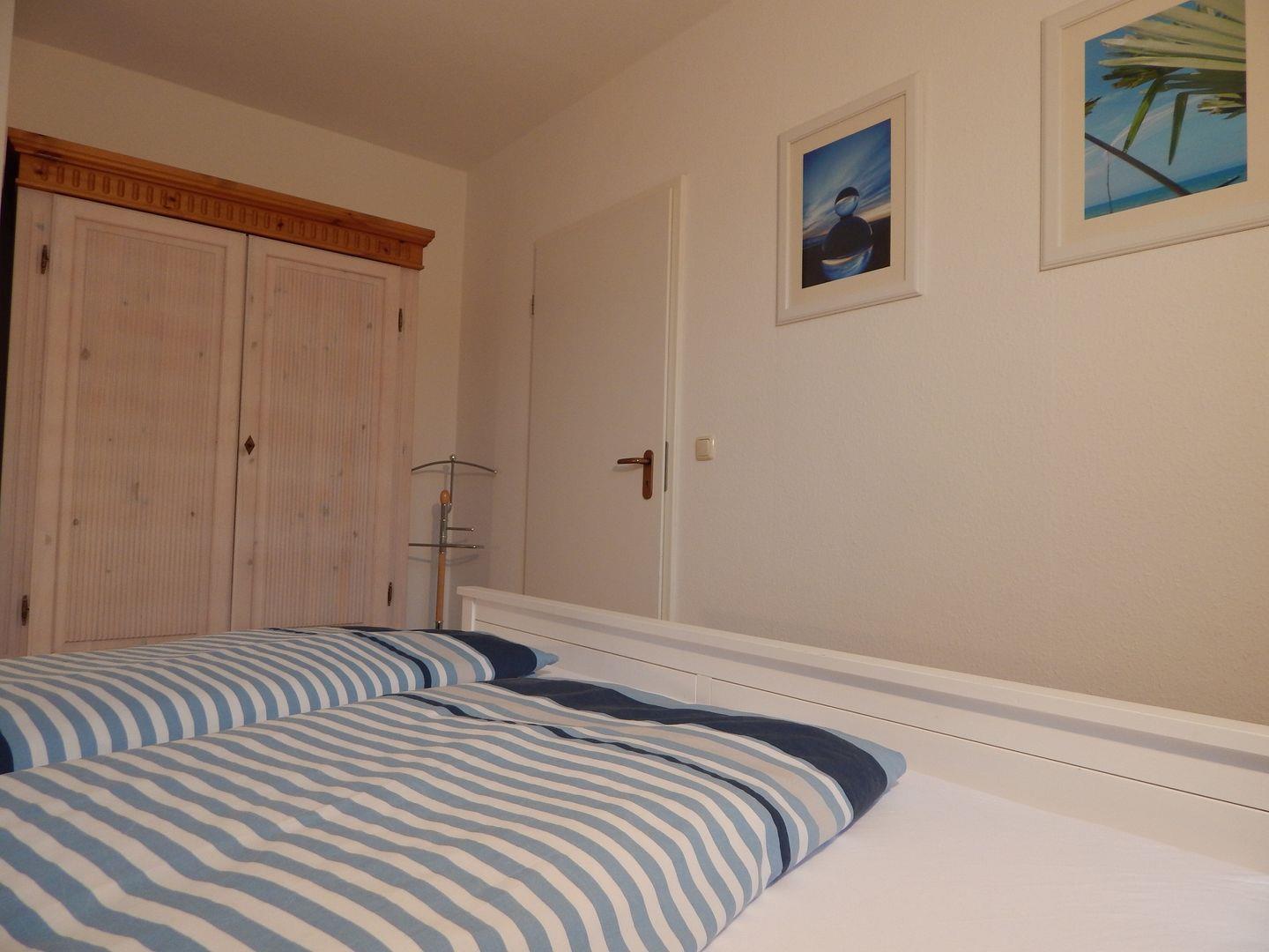Vom Wohnzimmer aus gelangen Sie in eines der Schlafzimmer, dort stehen für Sie ein Bett (180 x 200 cm) mit zwei getrennten Matratzen und einem Kleiderschrank zur Verfügung.