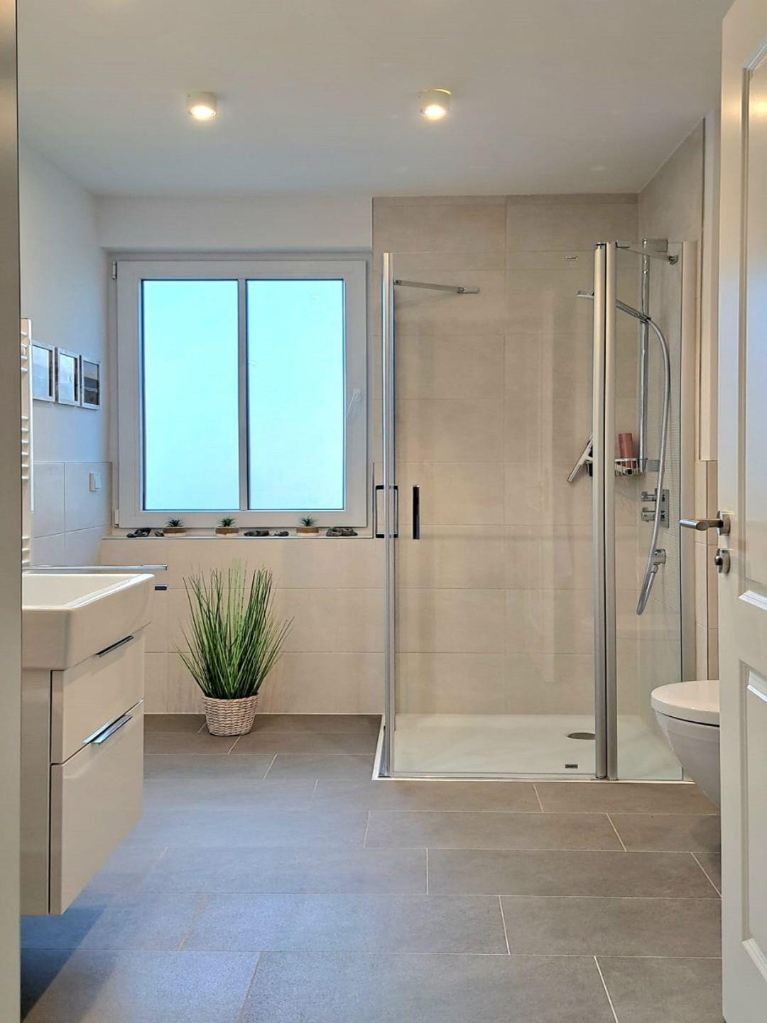 Das geräumige Bad ist mit einer ebenerdigen Dusche, Fußbodenheizung und Handtuchheizkörper