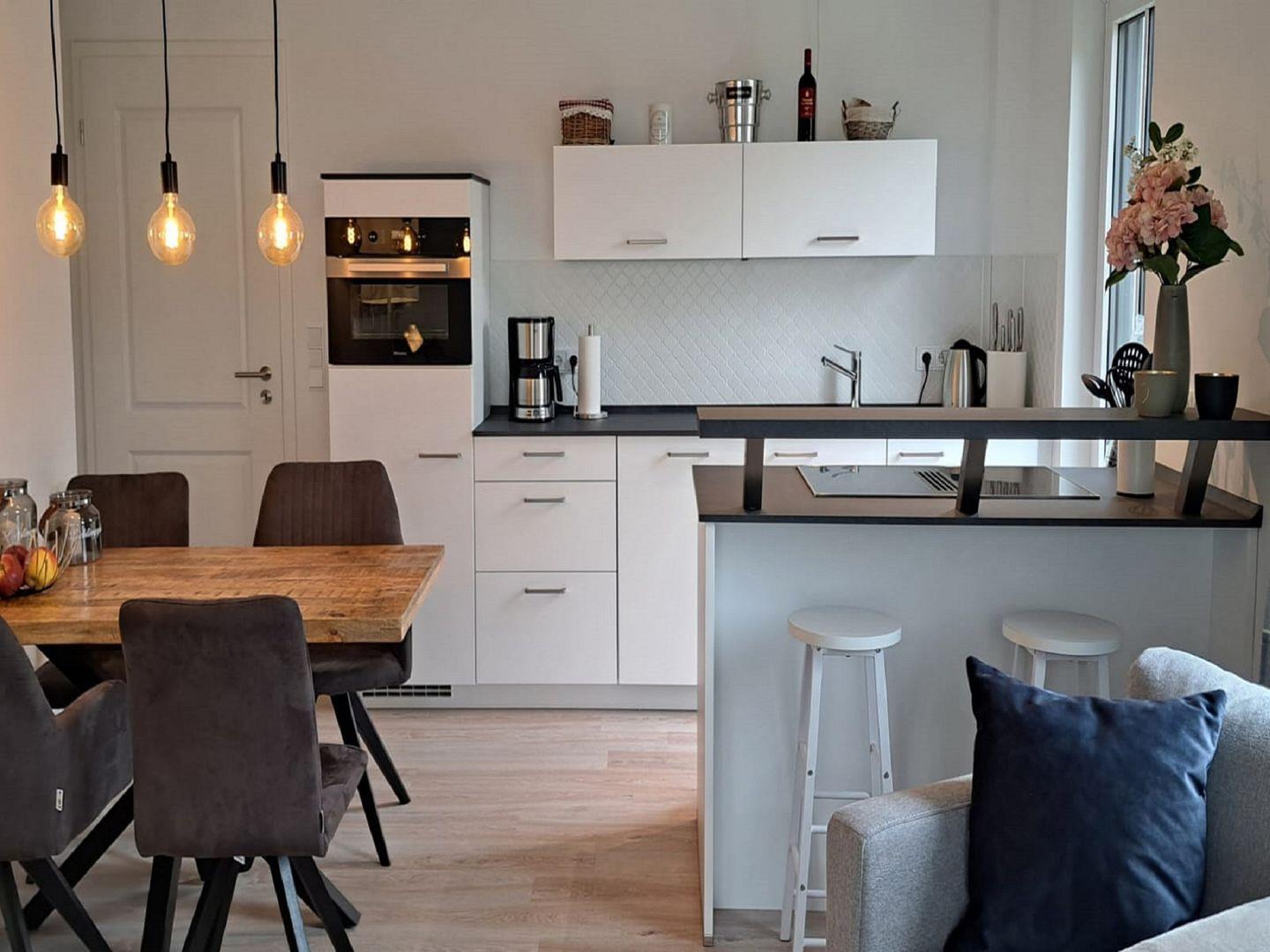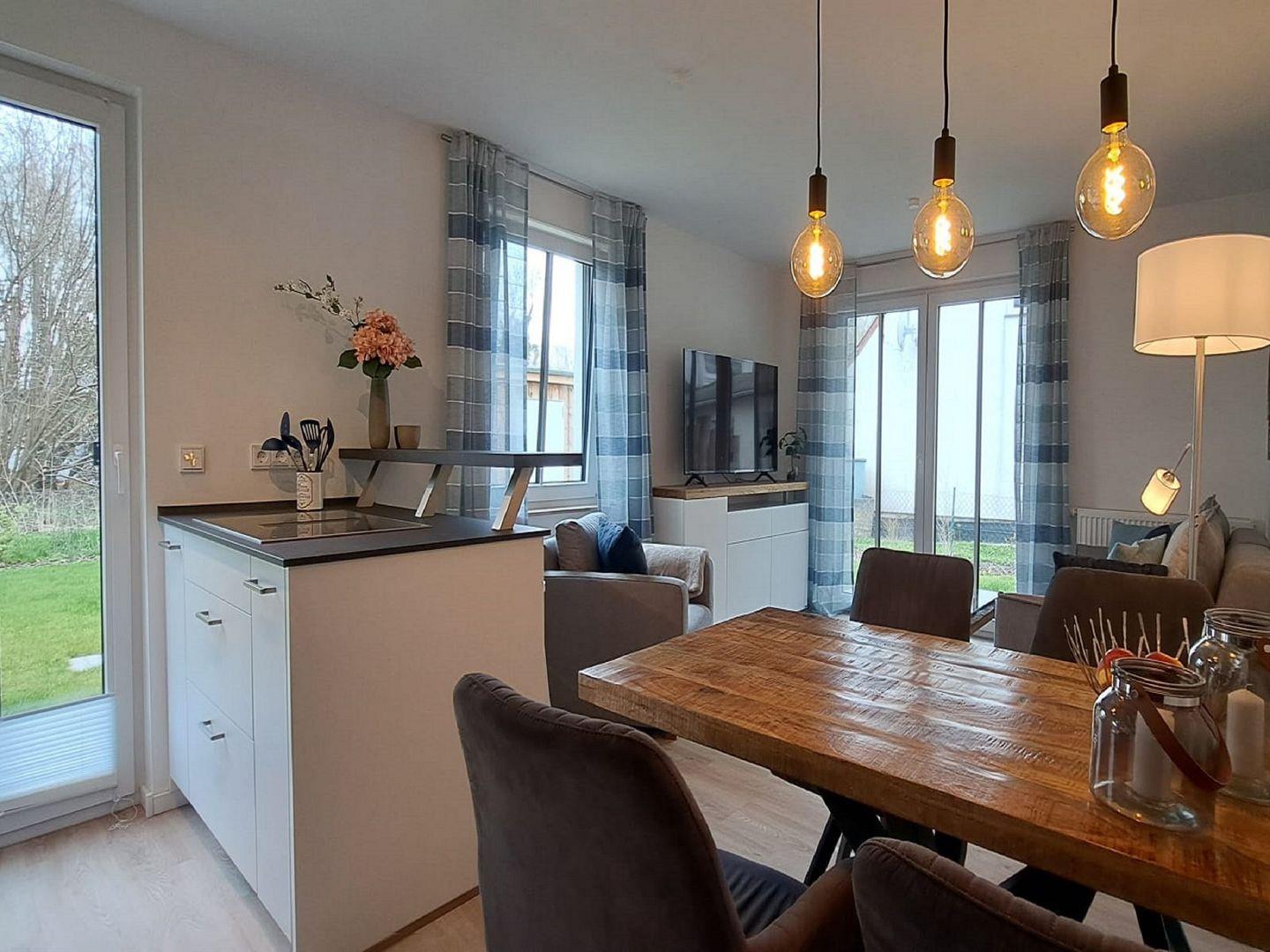 Der Wohnbereich empfängt Sie mit einer offenen Küchenzeile, bequemen Essplatz und einem