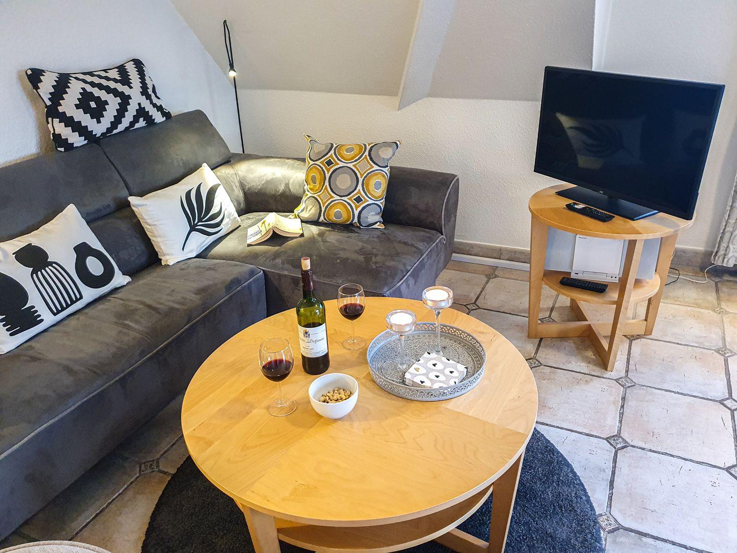 Genießen Sie die offene Gestaltung, die den Wohnbereich mit der voll ausgestatteten Küche verbindet. Hier finden Sie alles, was Sie für einen entspannten Aufenthalt benötigen: einen Cerankochherd, Backofen, Geschirrspüler und einen Kühlschrank mit Gefrierfach. Mit Küchenutensilien, Toaster, Wasserkocher und einer Kaffeemaschine sind Sie bestens ausgestattet, um Ihre Lieblingsgerichte zu zaubern. Der Essbereich mit einem einladenden Esstisch bietet Platz für gemeinsame Mahlzeiten und gesellige Abende.