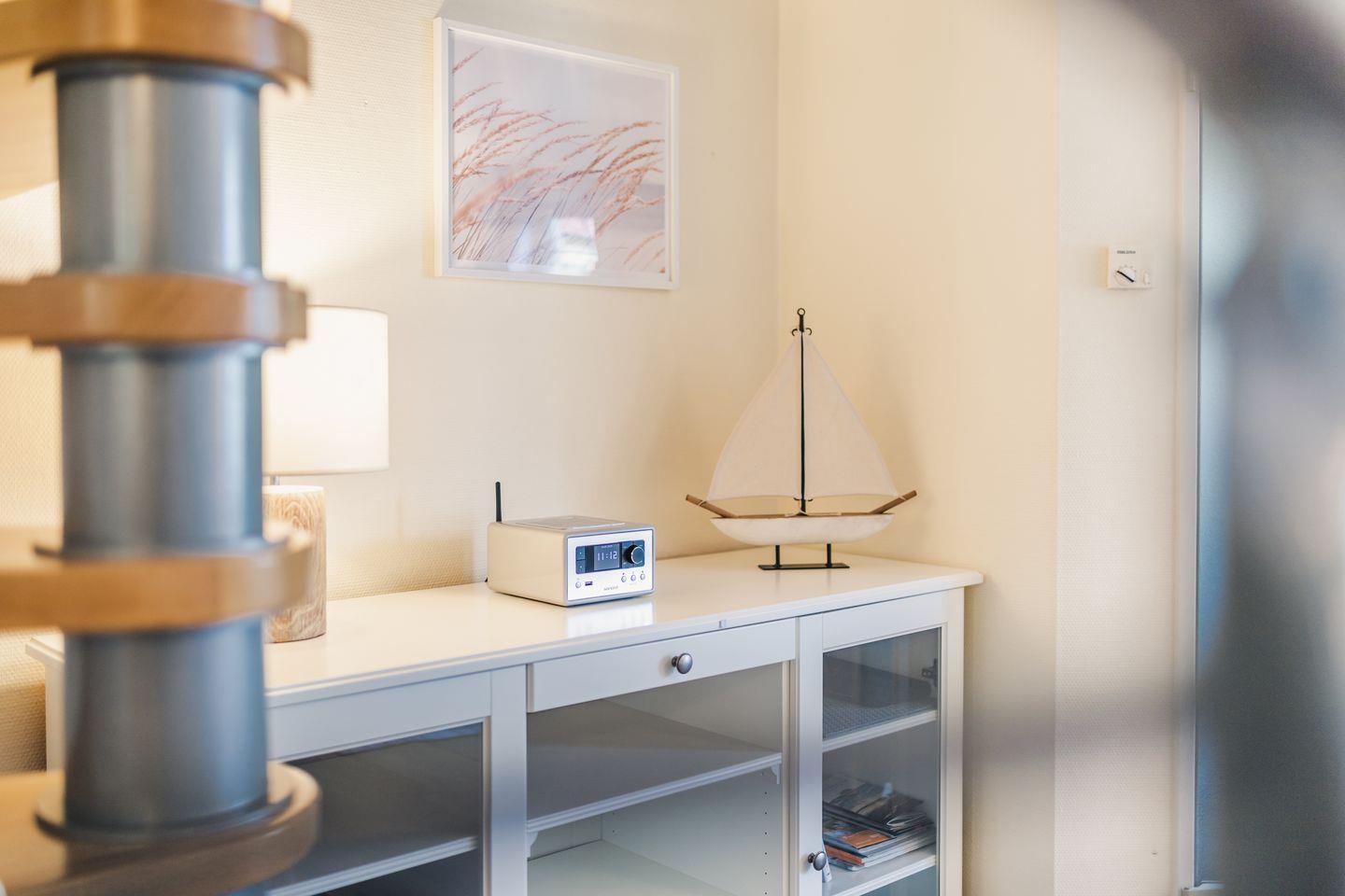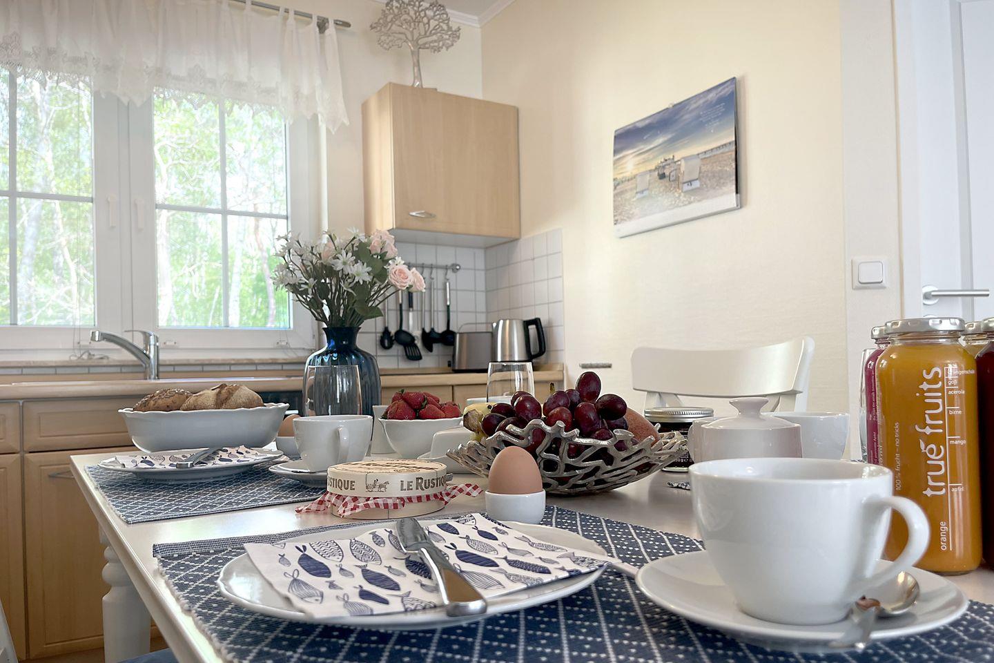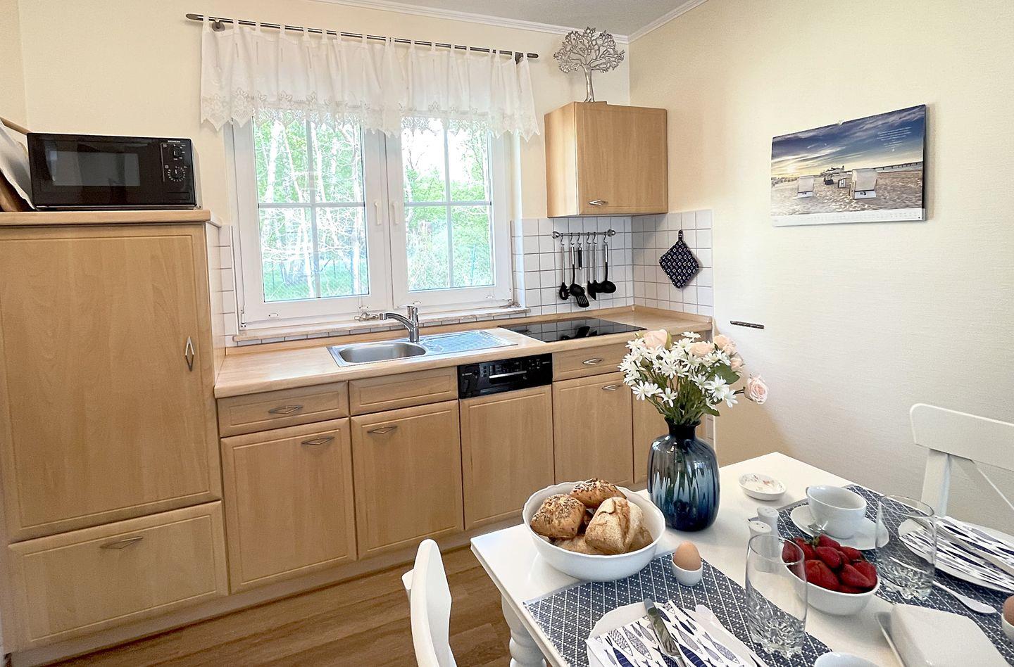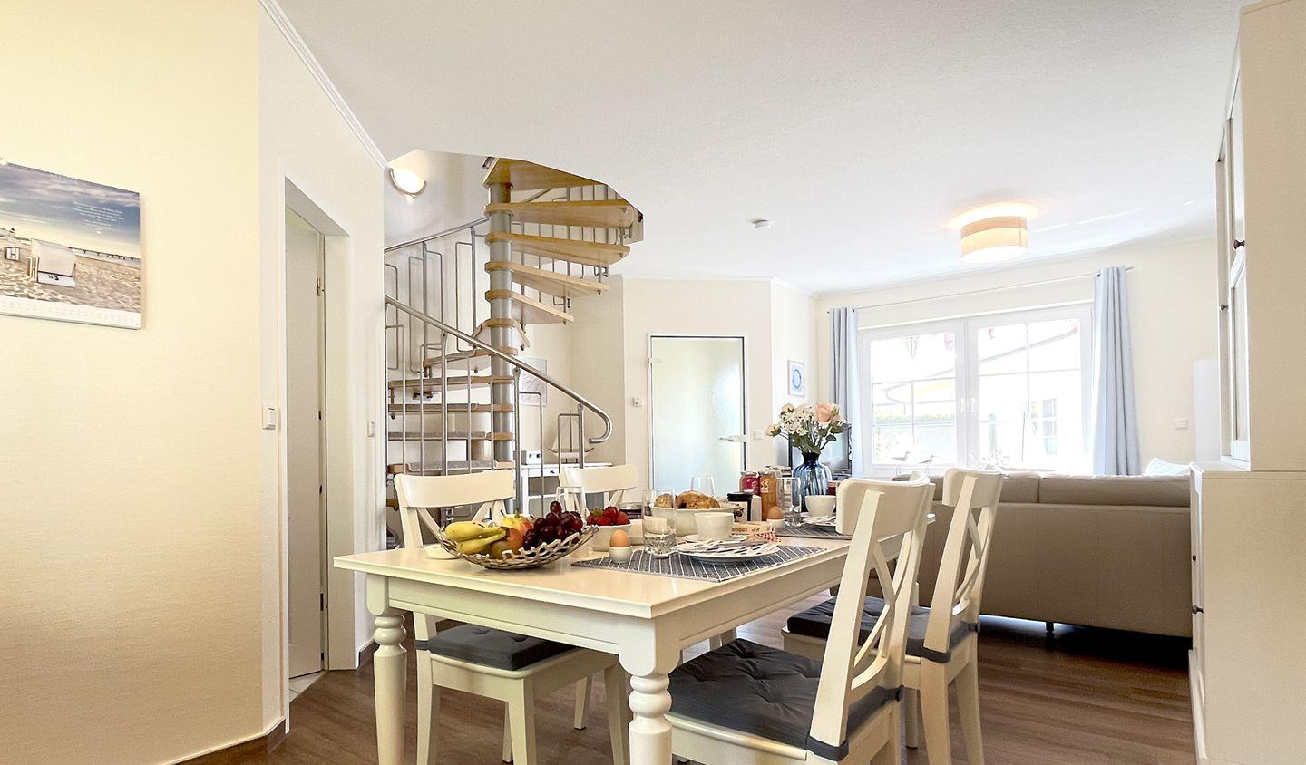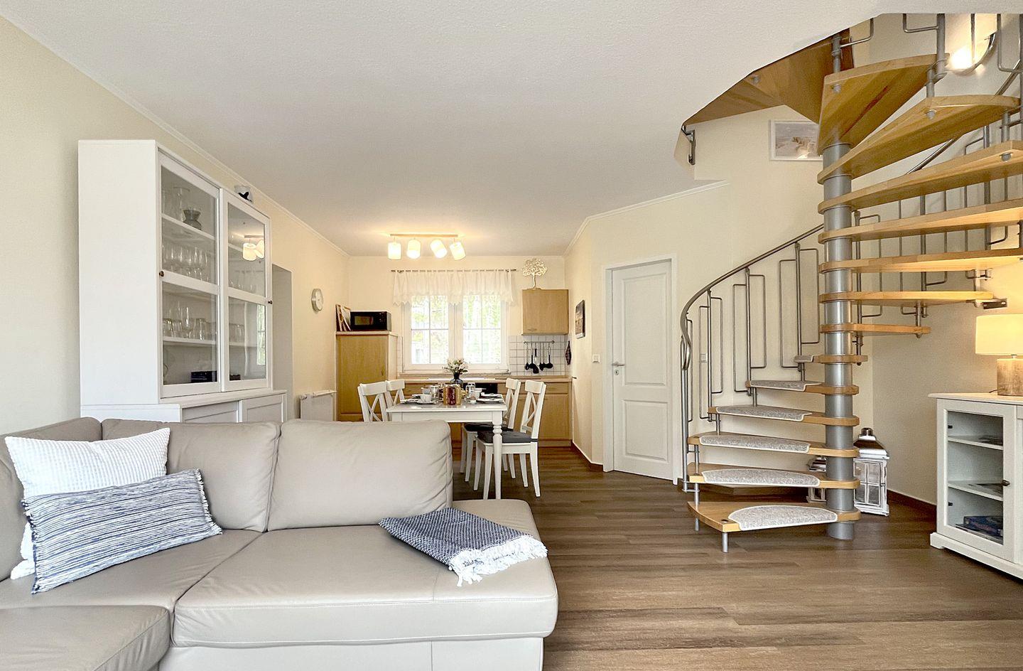 Die liebevolle eingerichtete Doppelhaushälfte liegt in bester Lage zum wunderschönen Strand in Zingst. Das Haus wurde 2023 komplett renoviert und größtenteils neu möbliert. Im Erdgeschoss befindet sich der gemütliche Wohnbereich mit Flat TV, Sofaecke und einer offenen Küche mit großzügigem Essbereich. Weiterhin befindet sich im Erdgeschoss ein komplett renoviertes, modernes Duschbad mit Fußbodenheizung. Die beiden Schlafzimmer befinden sich im Obergeschoss, welche über eine Wendeltreppe zu erreichen ist. Eines der Schlafzimmer verfügt über ein großes, bequemes Doppelbett. Das andere Schlafzimmer ist mit zwei komfortablen Einzelbetten sowie einem Flat TV ausgestattet. Zudem befindet sich im Obergeschoss ein weiteres Gäste-Bad. Am Haus befinden sich zwei Terrassen (Ost- und Westausrichtung), auf denen Sie an sonnigen Tagen sowohl die Sonne genießen können, aber ein auch ein schattiges Plätzchen am Rande eines kleinen Wäldchens. Ein abschließbarer Abstellraum und ein Fahrradständer sich ebenfalls vorhanden.