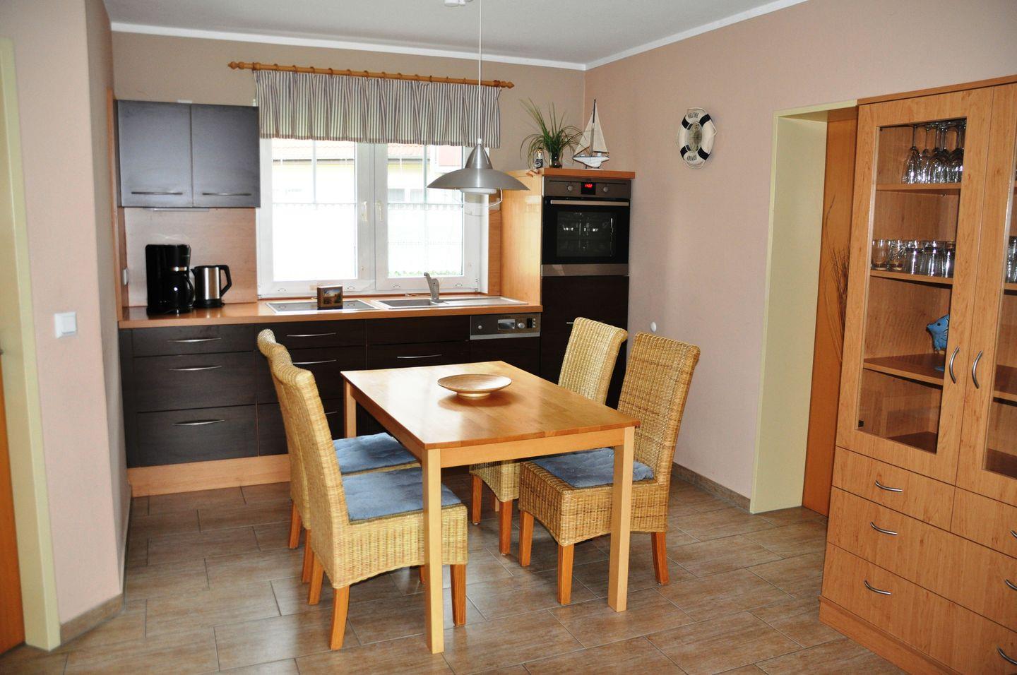 Der offen gestaltete Wohn-, Ess- und Kochbereich liegt im Parterre und ist einladend möbliert. Eine hochwertige, voll ausgestattete Küche mit Ceran-Herd, Kühlschrank mit Gefrierfach, Backofen, Spülmaschine, Kaffeemaschine, Wasserkocher, Toaster sowie sämtlichen Küchenutensilien lässt keine Wünsche offen. Fliesenböden im Wohnzimmer sowie Teppich in den Schlafzimmern verbinden praktische Aspekte mit einer wohnlichen Atmosphäre. Die Zentralheizung und ein Kaminofen sorgen auch an kühleren Tagen für wohlige Wärme.