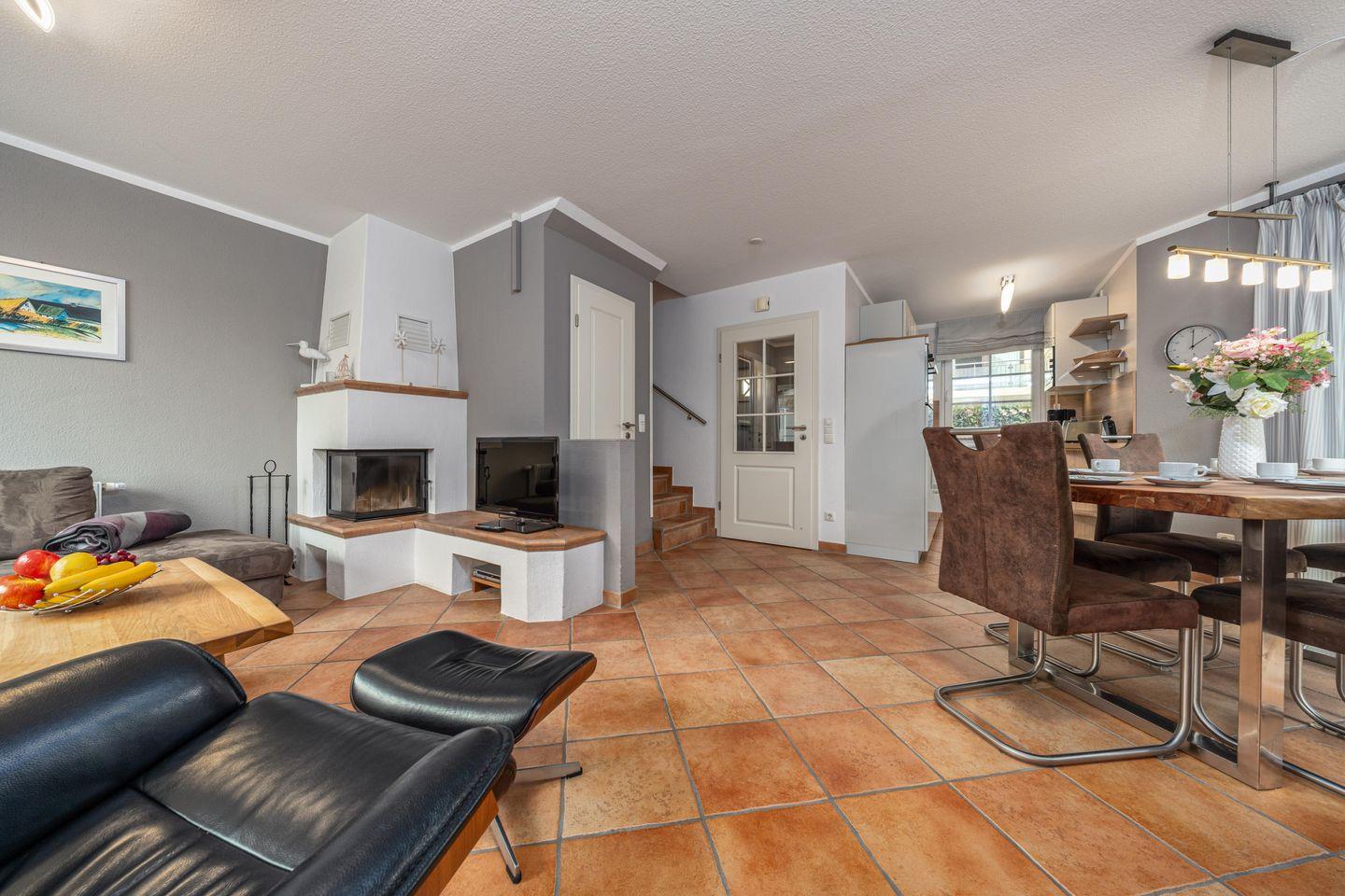 Im Erdgeschoss ist der Wohnbereich mit Kamin, integrierter Küche, Essecke und Zugang zur Terrasse und dem Garten. Beide Schlafzimmer sind mit einem Fernseher ausgestattet. Zum Haus gehört ein PKW Stellplatz, ein Fahrradschuppen und eine Waschmaschine ist ebenfalls vorhanden. Genießen Sie entspannte Stunden in der eigenen Sauna oder entspannen Sie im Garten. Das Haus Mine Heimat Weg Twee ist der ideale Ort für einen erholsamen Urlaub in Zingst.