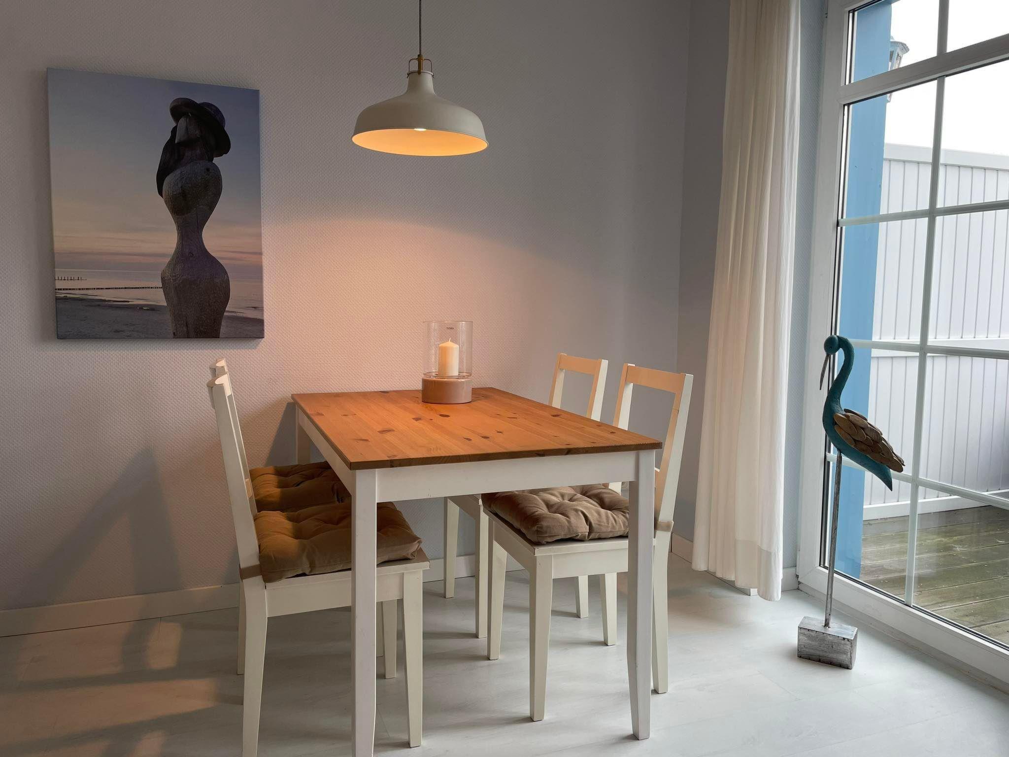 Die helle Ferienwohnung im maritimen Flair ist ca. 50m² groß und bietet Platz für bis vier Personen. Das gemütliche Wohnzimmer lädt mit seinen Sitzgelegenheiten und einem SAT-TV zum Verweilen ein. Das Sofa kann auch als Schlafgelegenheit für zwei Personen genutzt werden. Die offene Küche ist mit allen wichtigen Küchenutensilien und reichlich Geschirr ausgestattet. Weiterhin stehen ein Geschirrspüler, E-Herd, Kaffeemaschine, Senseo, Wasserkocher und ein Toaster für Sie bereit. Im hellen separaten Schlafzimmer mit einem Doppelbett und einem Kleiderschrank können Sie nach einem erlebnisreichen Tag neue Energie tanken. Das moderne Badezimmer mit ebenerdiger Dusche und einem WC lässt ebenfalls keine Wünsche offen. Die Wohnung verfügt über einen WLAN-Anschluss.