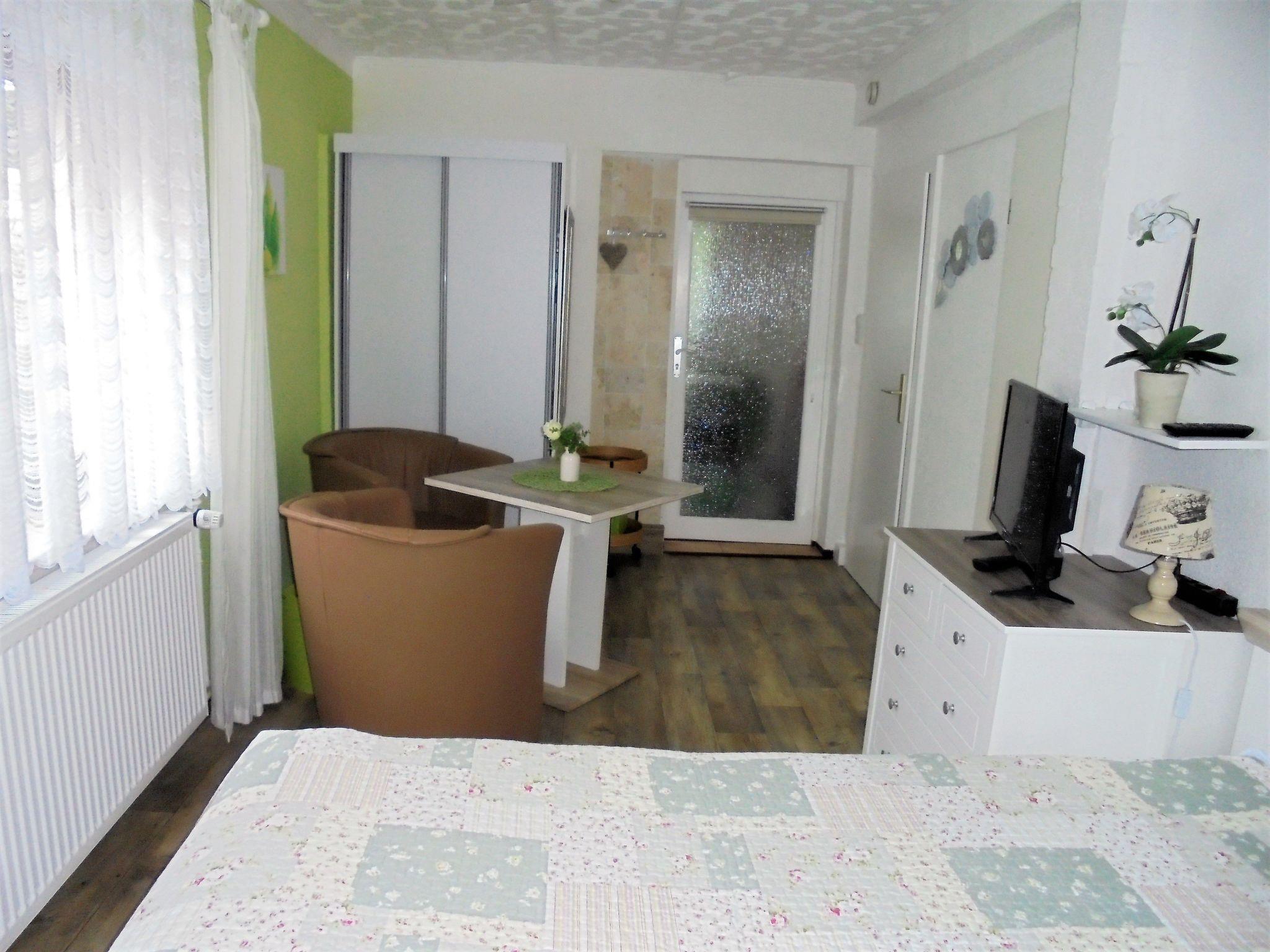 Die kleine Ferienwohnung liegt parterre und hat einen separaten Eingang mit kleinem Vorflur. Der Wohn-/ Schlafraum ist mit gemütlicher Sitzecke, SAT/TV und Radio mit CD u. Stick ausgestattet, ebenso mit Internet/WLAN (kostenlos) und einer kleinen Auswahl an Büchern und Spielen. Sie schlafen in einem Doppelbett (180x200). Es gibt eine separate Küchenzeile, die zum Wohn-/ Schlafraum durch eine Tür geschlossen wird. Sie werden also nicht durch Kühlschrankgeräusche gestört. Kochen m. Induktion, Mikrowelle, Kaffeemaschine, Wasserkocher, Toaster usw. sind vorhanden. In der kleinen Ferienwohnung kleines WC/Dusche/Fön Außenrollo