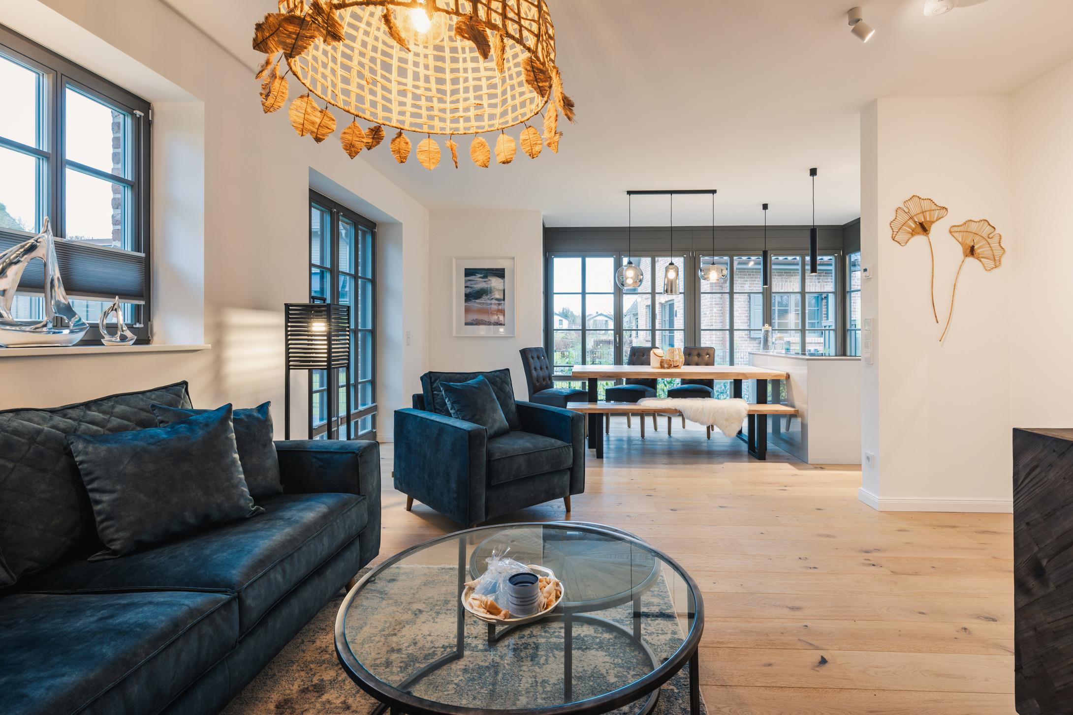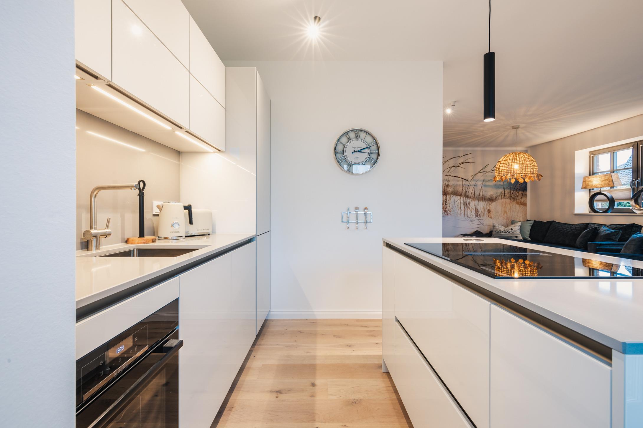 Das Ferienhaus ist gemütlich und komfortabel eingerichtet, um Ihren Aufenthalt so angenehm wie möglich zu gestalten. Der offene Wohnbereich verfügt über eine einladende Sofalandschaft, einen Esstisch und große Fenster, die viel Tageslicht hereinlassen. Die Küche ist mit einer Kochinsel versehen und bietet somit gesellige Kochabende mit Blick ins Grüne. Selbstverständlich ist die Küche mit modernen Markengeräten wie einem Geschirrspüler, Backofen und einer Kaffee Kapselmaschine ausgestattet.