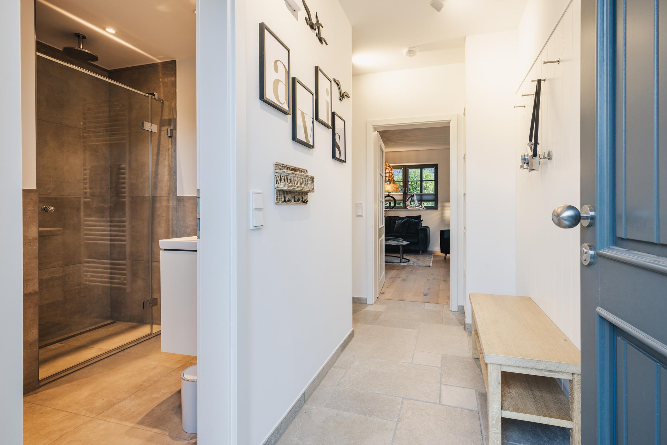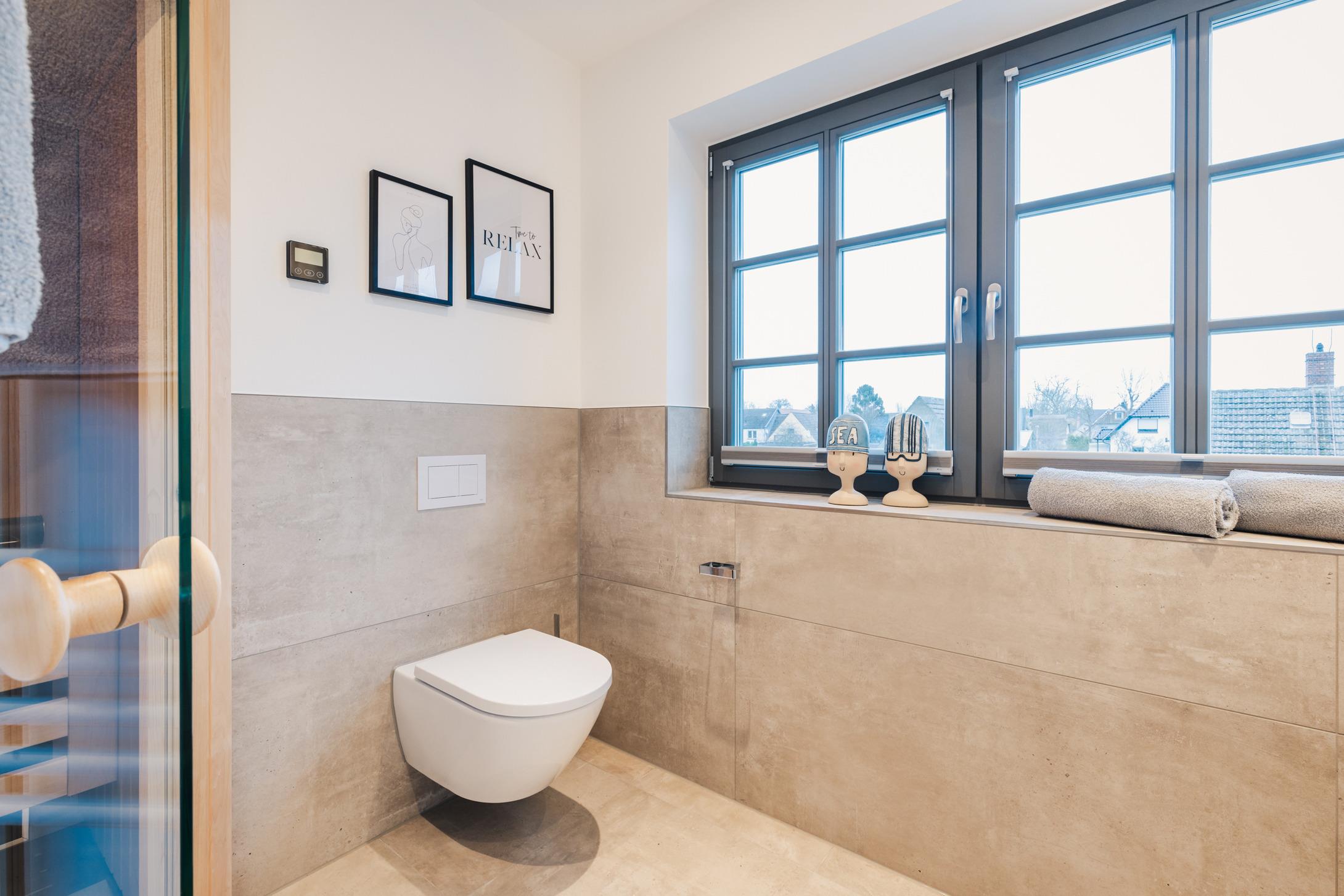 Das Ferienhaus verfügt über zwei moderne Badezimmer, die beide mit geräumigen Duschen und hochwertigen Armaturen ausgestattet sind. Das Hauptbadezimmer bietet zusätzlich eine entspannende Sauna, in der Sie die Wärme genießen und neue Energie tanken können.