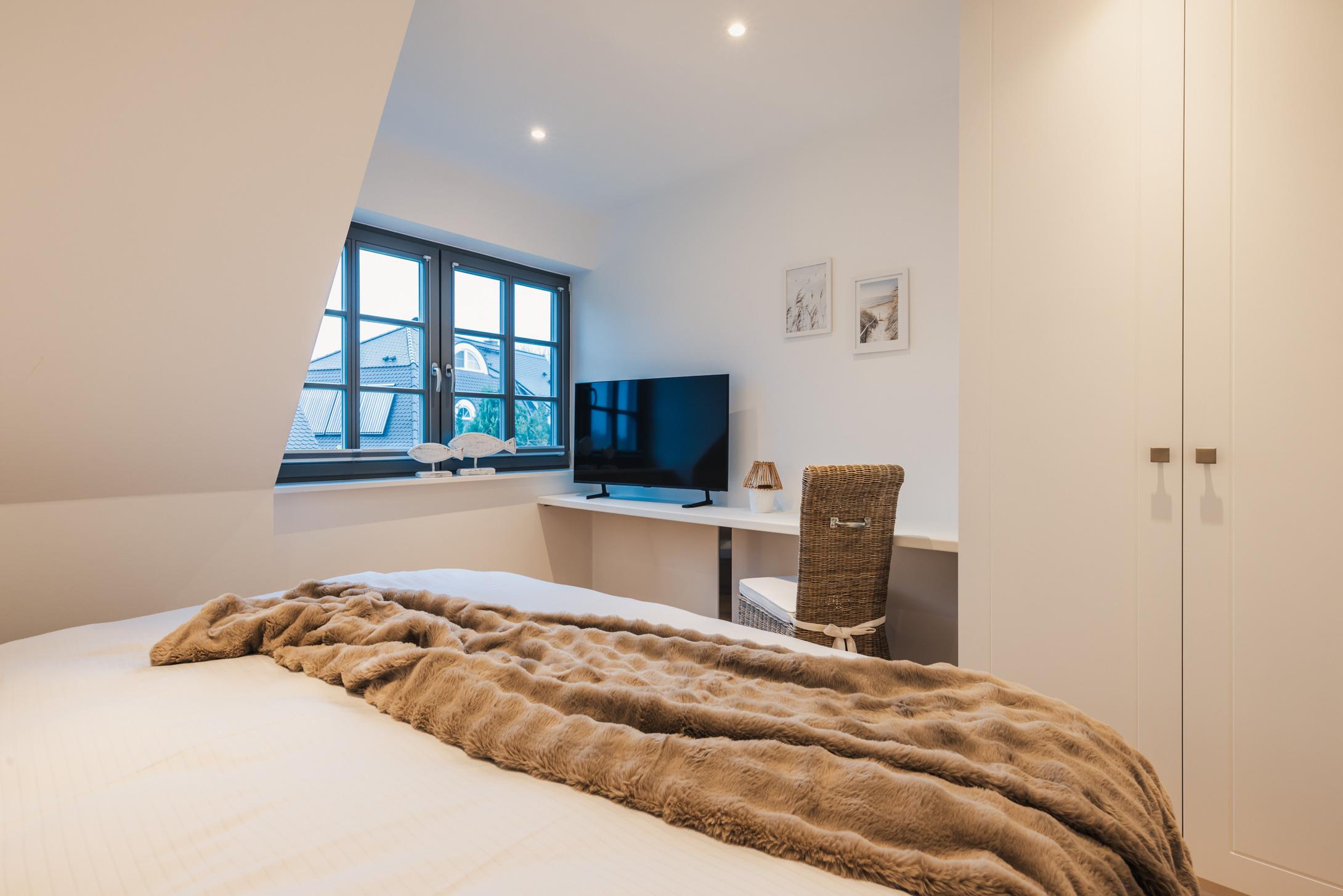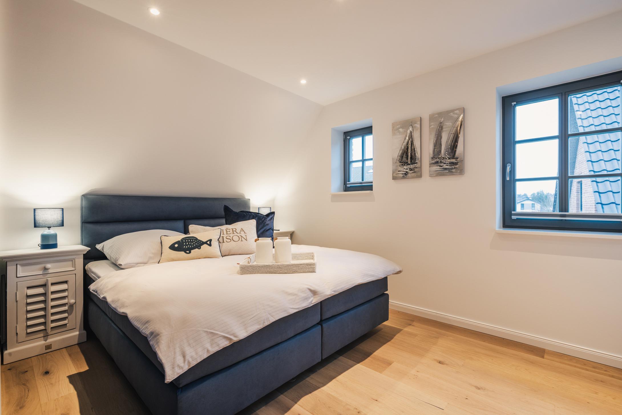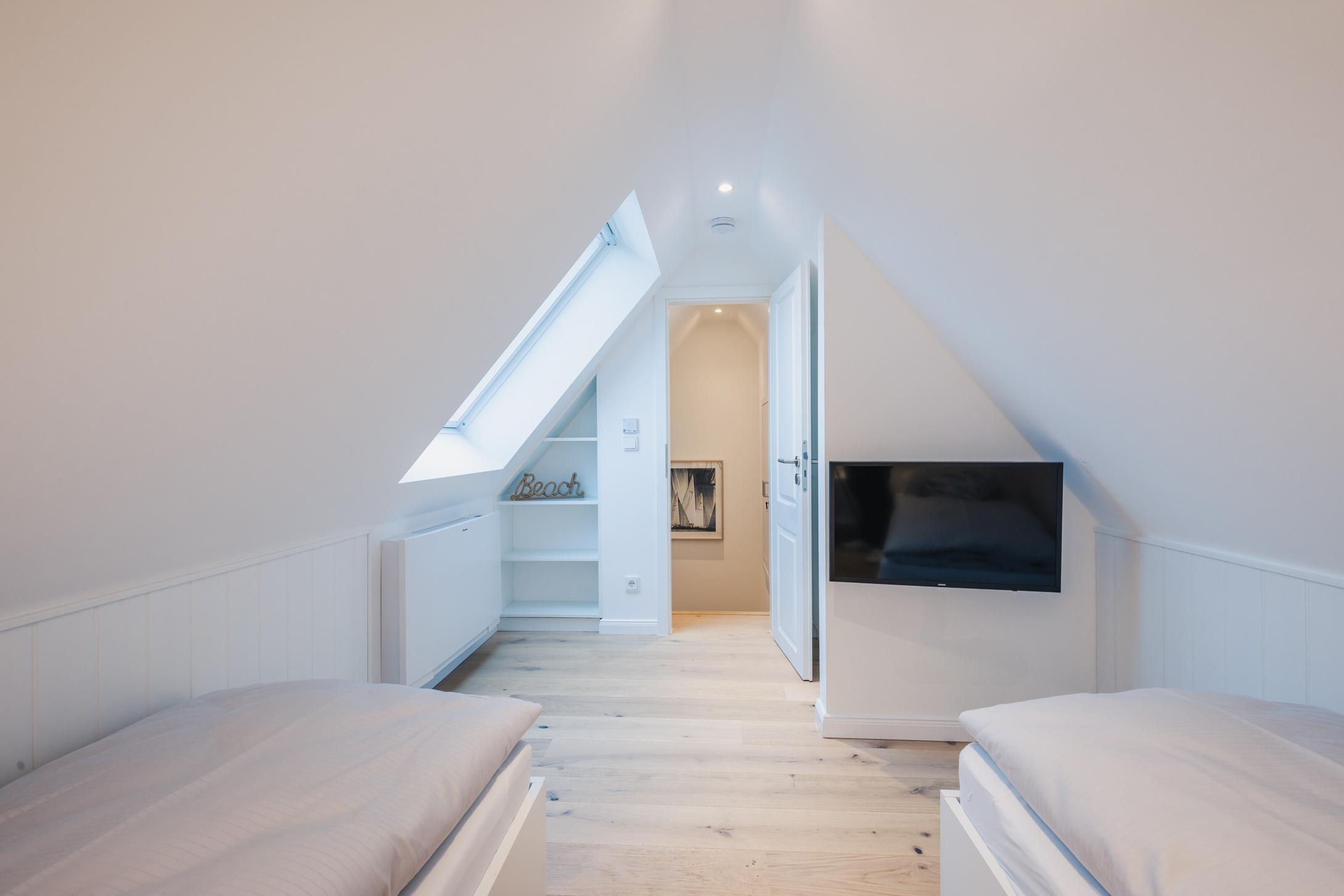 Die drei Schlafzimmer sind mit zwei bequemen Boxspringbetten und zwei Einzelbetten eingerichtet. Verdunkelnde Plissees sorgen für erholsame Nächte, und alle Schlafzimmer bieten ausreichend Stauraum für Ihr Gepäck.Hinweis: Die Betten sind bei Ihrer Anreise stets frisch bezogen. Bitte beachten Sie, dass grundsätzlich immer nur so viele Betten bezogen werden, wie Personen anreisen. Da das Haus über zwei Doppelbetten und zwei Einzelbetten verfügt, werden bei einer Buchung von vier Personen standardmäßig die beiden Doppelbetten vorbereitet, gleiches gilt auch bei zwei Personen, da wird nur ein Doppelbett bezogen. Wir gehen davon aus, dass gemeinsam reisende Personen ein Doppelbett teilen. Sollten Sie eine andere Schlafaufteilung wünschen, teilen Sie uns dies bitte vor Ihrer Anreise mit, damit wir die Betten entsprechend vorbereiten können. Eine Einsicht in das persönliche Verhältnis der Reisenden besteht selbstverständlich nicht.