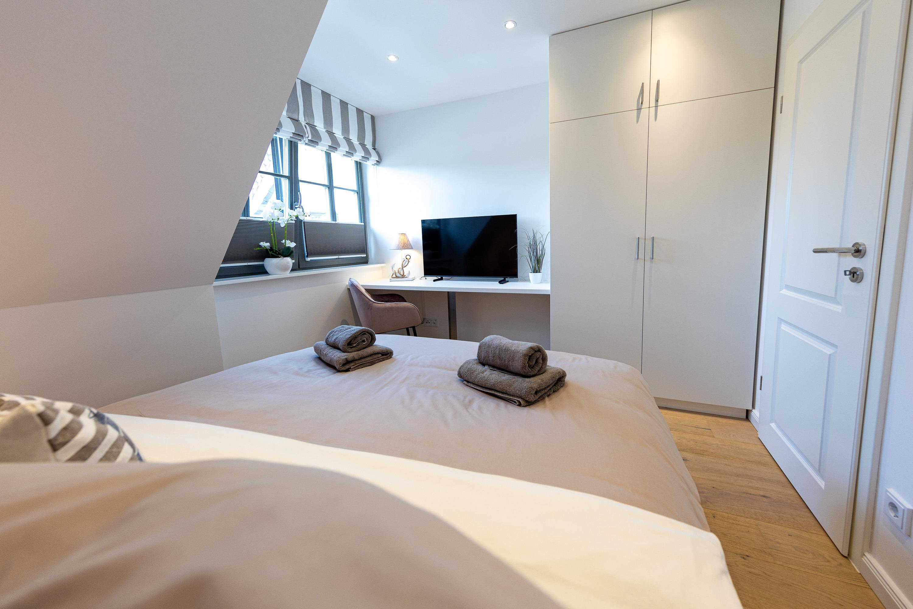 Hinweis: Die Betten sind bei Ihrer Anreise stets frisch bezogen. Bitte beachten Sie, dass grundsätzlich immer nur so viele Betten bezogen werden, wie Personen anreisen. Da das Haus über zwei Doppelbetten und zwei Einzelbetten verfügt, werden bei einer Buchung von vier Personen standardmäßig die beiden Doppelbetten vorbereitet, gleiches gilt auch bei zwei Personen, da wird nur ein Doppelbett bezogen. Wir gehen davon aus, dass gemeinsam reisende Personen ein Doppelbett teilen. Sollten Sie eine andere Schlafaufteilung wünschen, teilen Sie uns dies bitte vor Ihrer Anreise mit, damit wir die Betten entsprechend vorbereiten können. Eine Einsicht in das persönliche Verhältnis der Reisenden besteht selbstverständlich nicht.