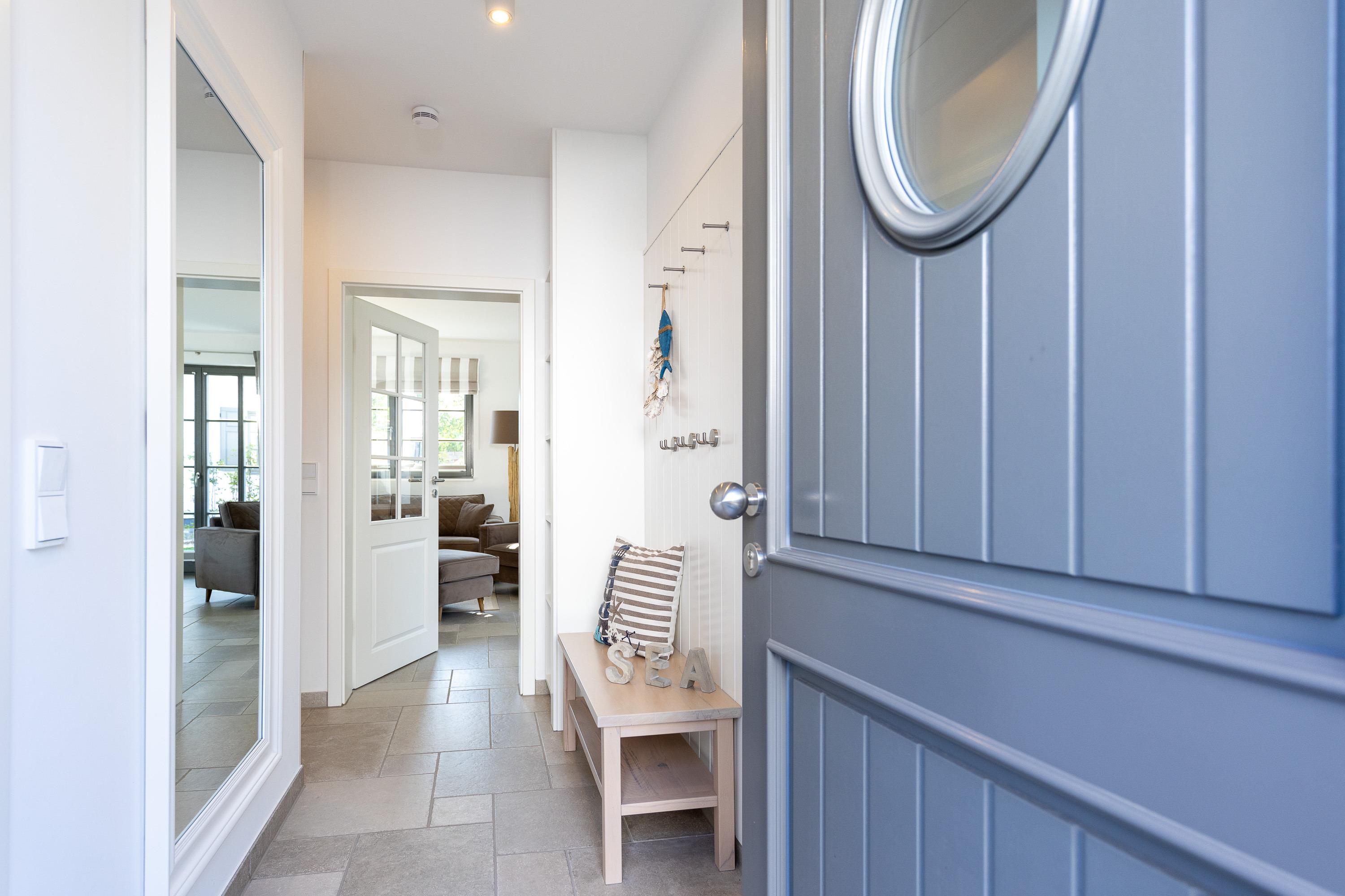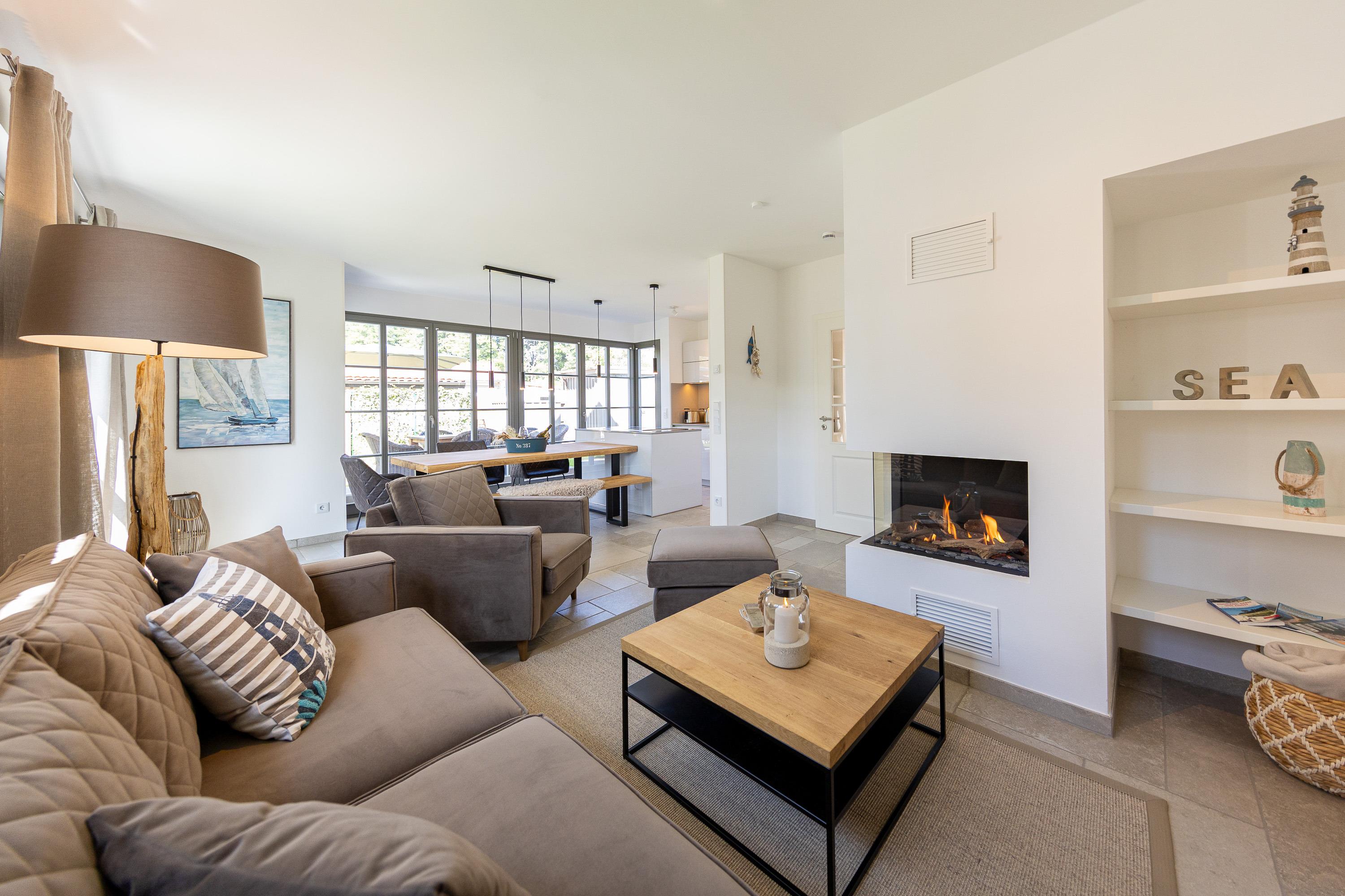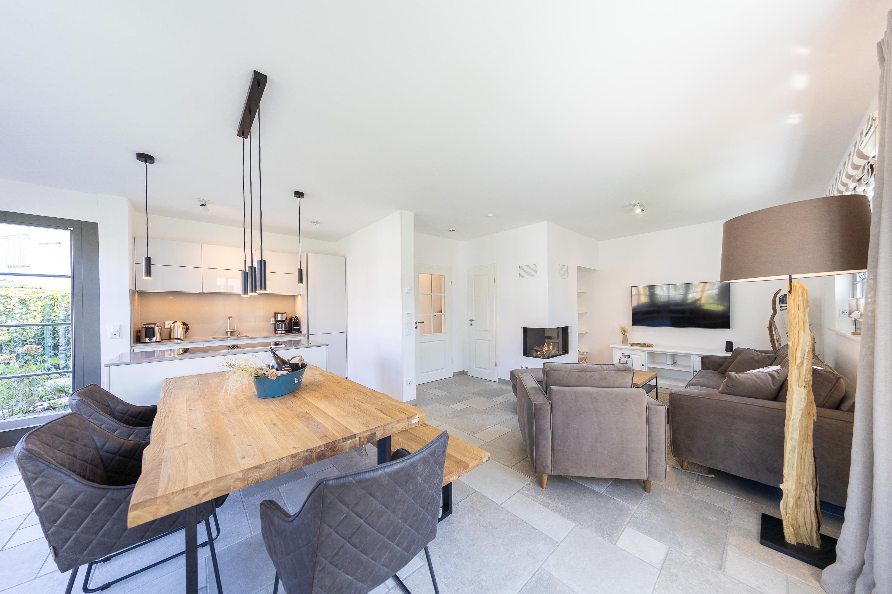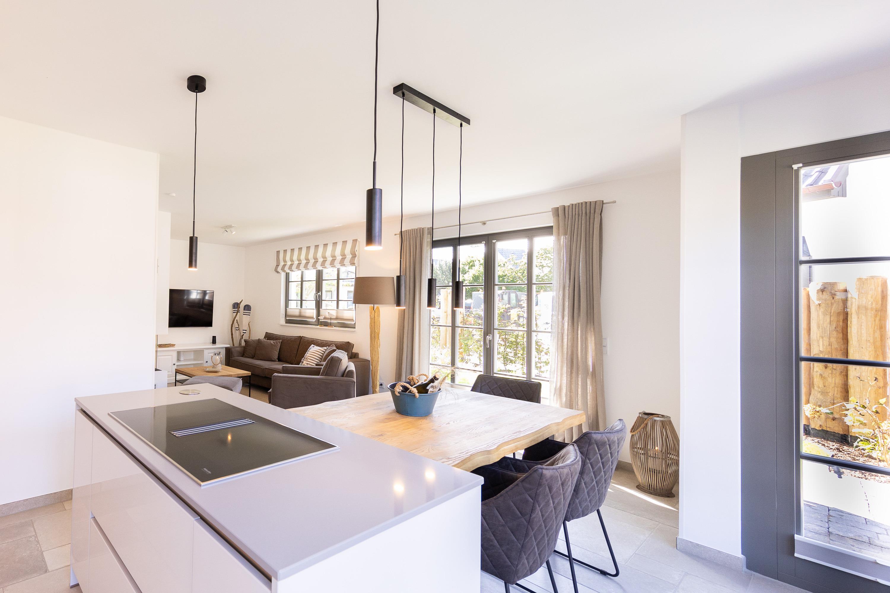 Das Ferienhaus besticht durch seine charmante und einladende Einrichtung. Dies verfügt über eine moderne Wohnküche mit Markengeräten, in der Sie gemeinsame Mahlzeiten zubereiten können. Der angrenzende Essbereich bietet Platz für die ganze Familie und ist der perfekte Ort, um gemeinsam zu essen oder Spieleabende zu veranstalten. Der offene Wohnbereich ist gemütlich und hochwertig ausgestattet und Sie können die Abende am Kamin genießen. Die großen Fenster lassen viel Sonnenlicht herein und schaffen eine angenehme Atmosphäre.