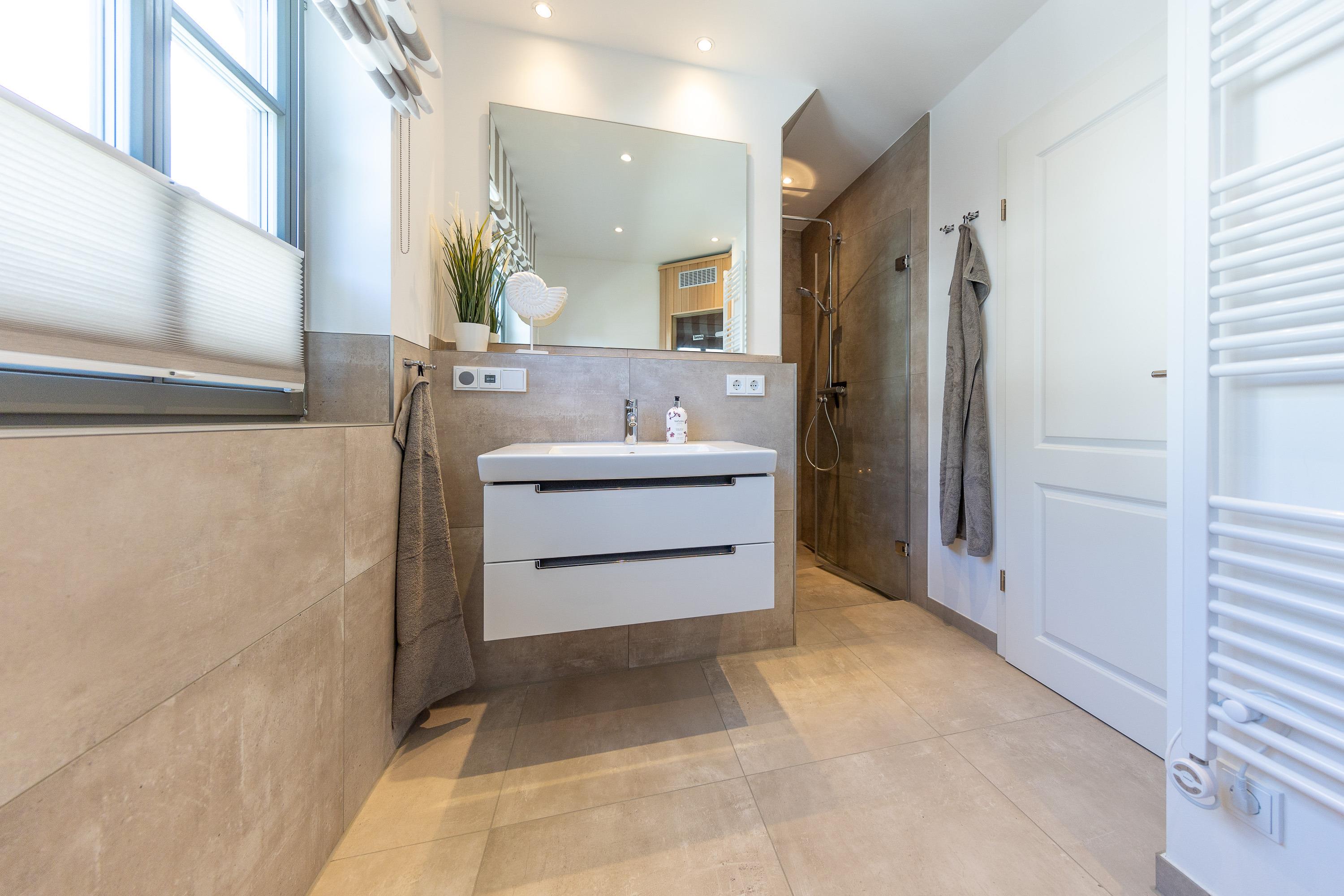 Das Ferienhaus bietet zwei moderne Bäder davon eine Dusche mit Sitzbank sowie eine Sauna in der Sie sich nach einem langen Strandtag entspannen können. Hier können Sie die Wärme genießen und neue Energie tanken.