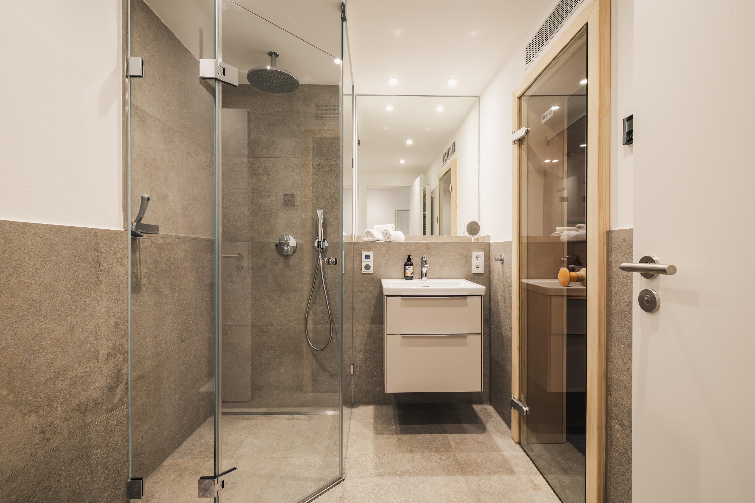 Ein elegantes Badezimmer mit Dusche und privater Sauna