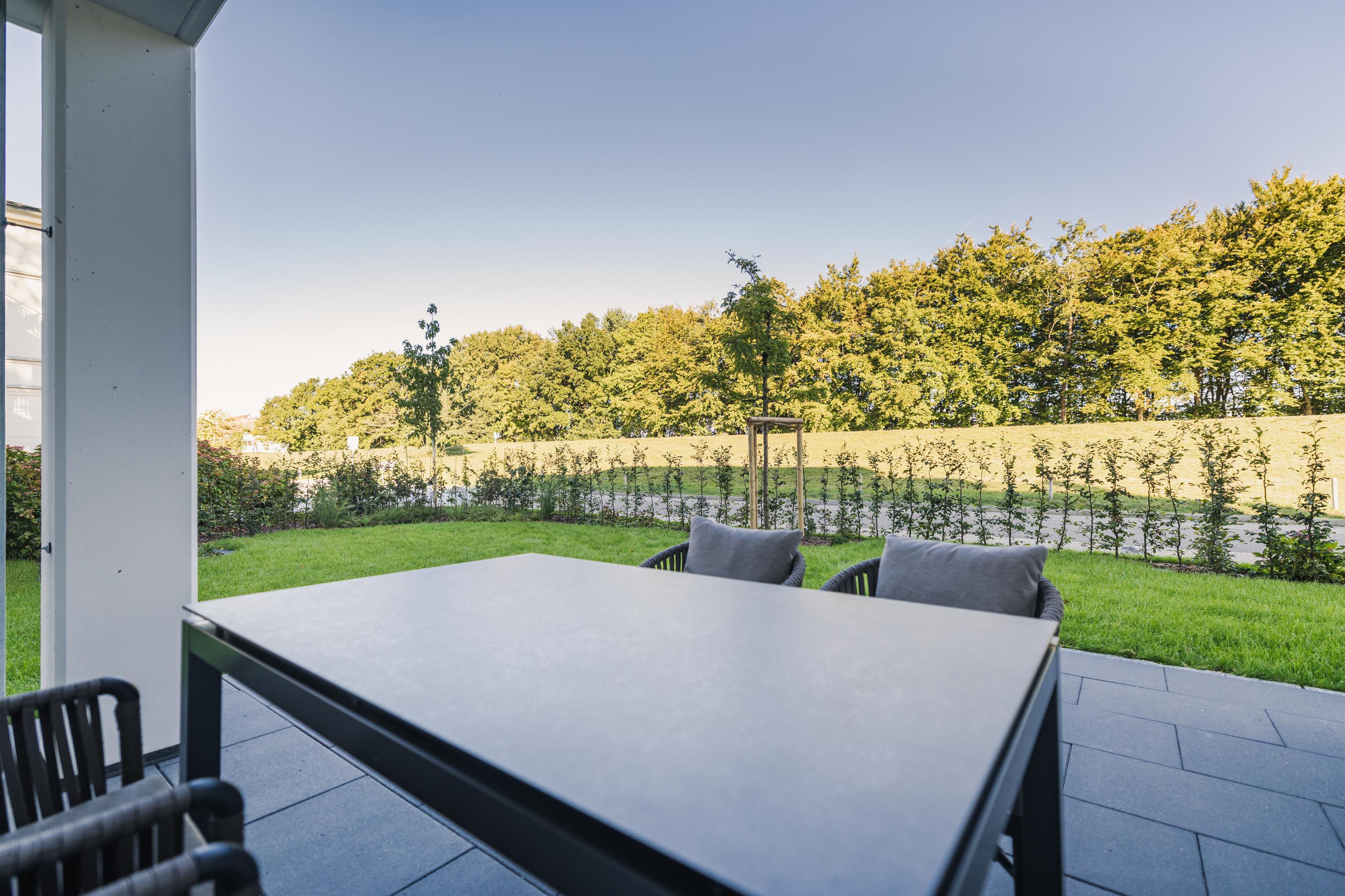 Dieses hochwertige 2-Zimmer-Appartement bietet auf etwa 60 m² modernen Wohnkomfort in bester Lage. Großzügige Fensterfronten durchfluten den Wohnbereich mit Licht und eröffnen den Blick in den liebevoll gestalteten Garten. Die angrenzende West-Nord-Terrasse lädt zu entspannenden Momenten oder gemeinsamen Mahlzeiten im Freien ein.