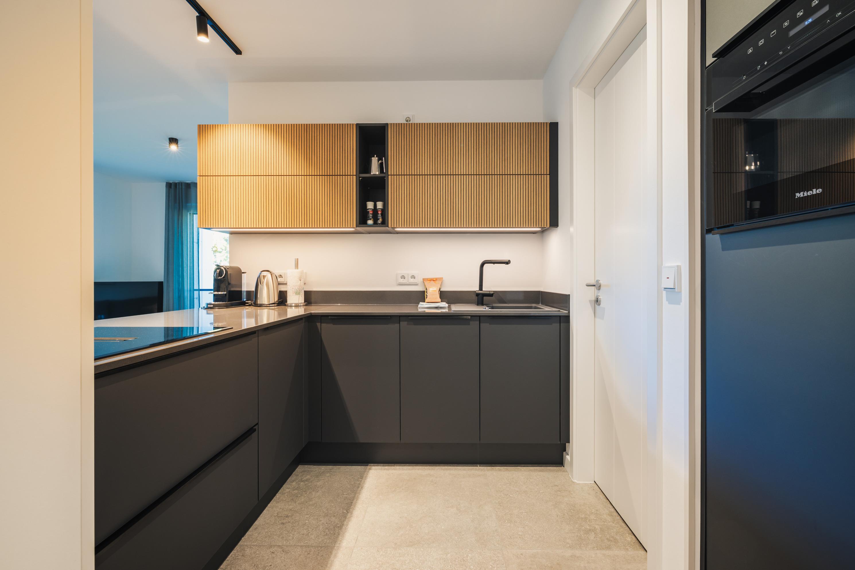 Eine offene, voll ausgestattete Einbauküche mit hochwertigen Markengeräten