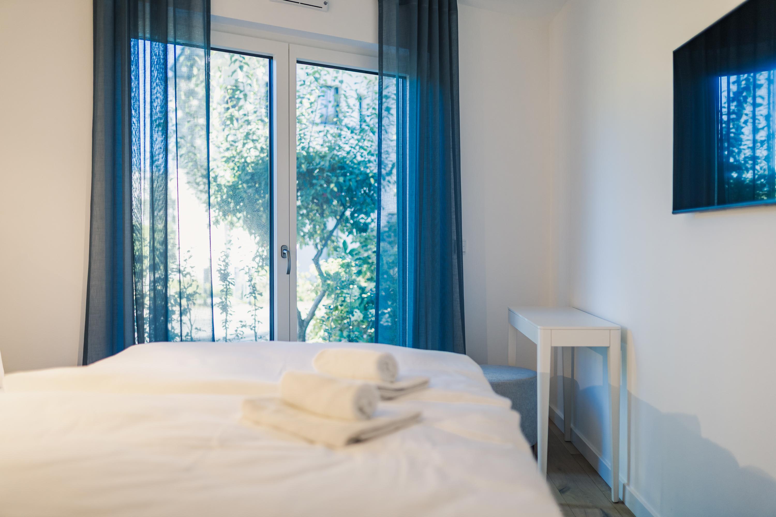 Ein gemütliches Schlafzimmer mit einem komfortablen Doppelbett und bodentiefen Fenstern