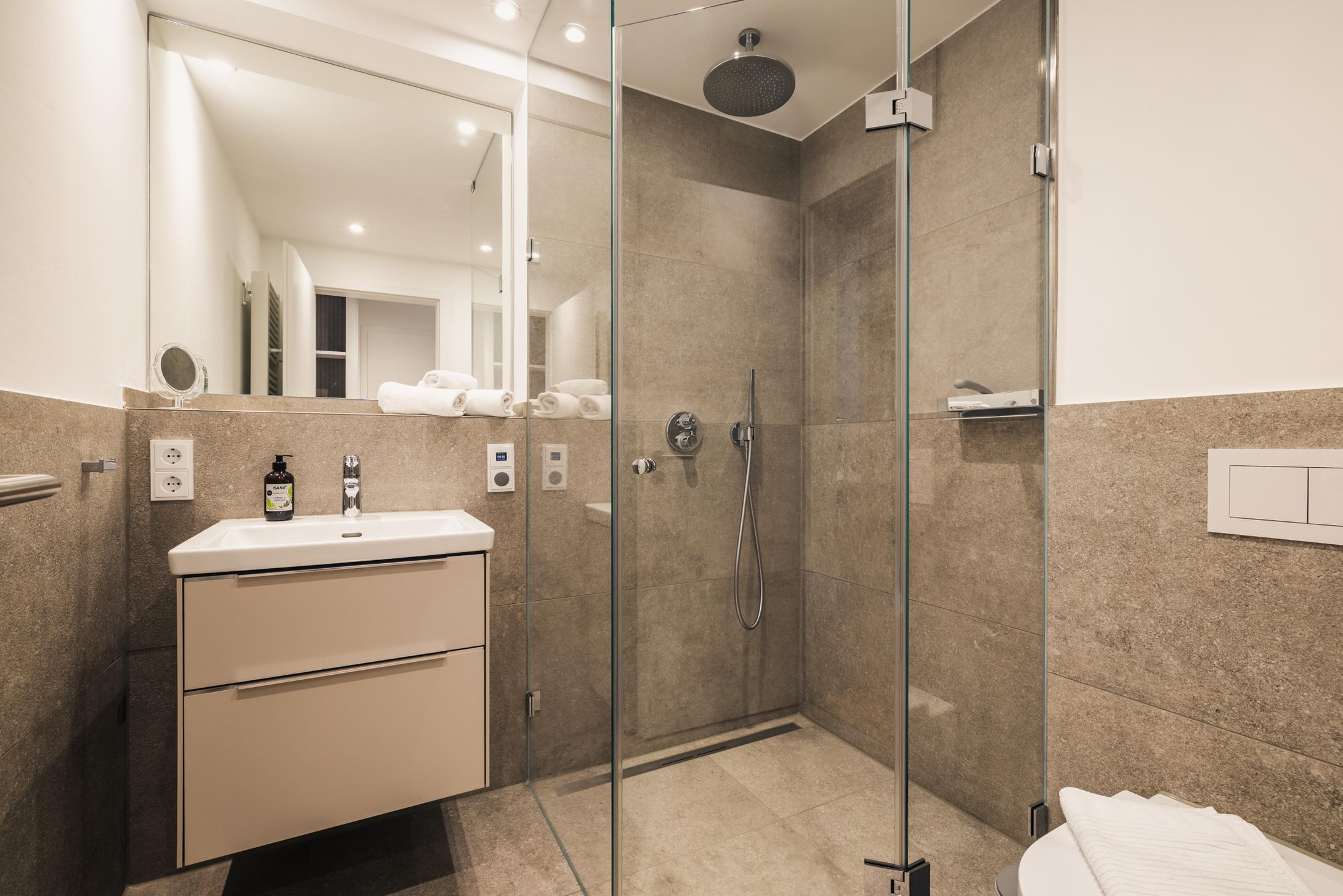 Modern gestaltetes Bad mit ebenerdiger Dusche