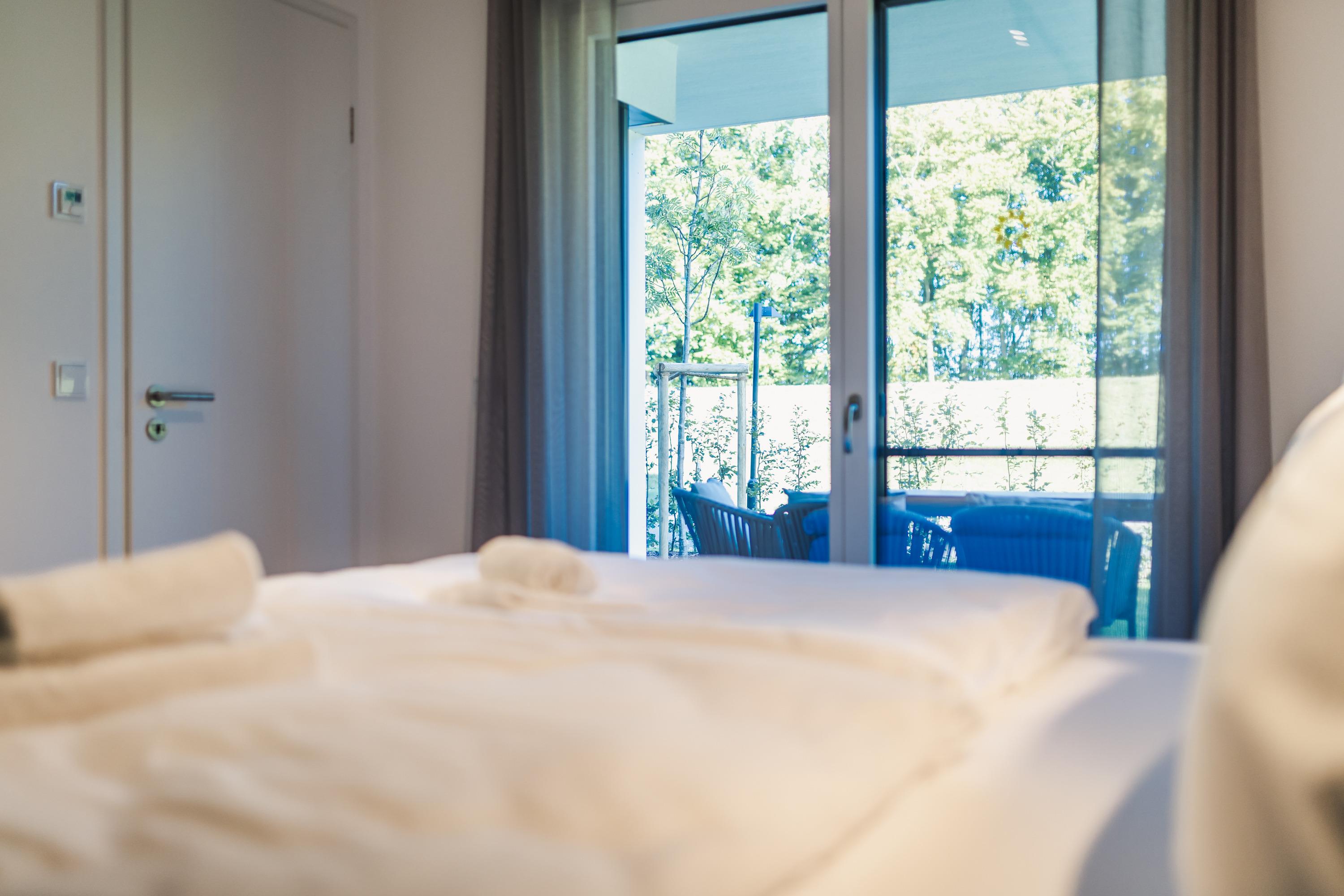 Helles, gemütliches Wohnzimmer sowie Schlafzimmer mit direktem Zugang zur Terrasse und in den Garten
