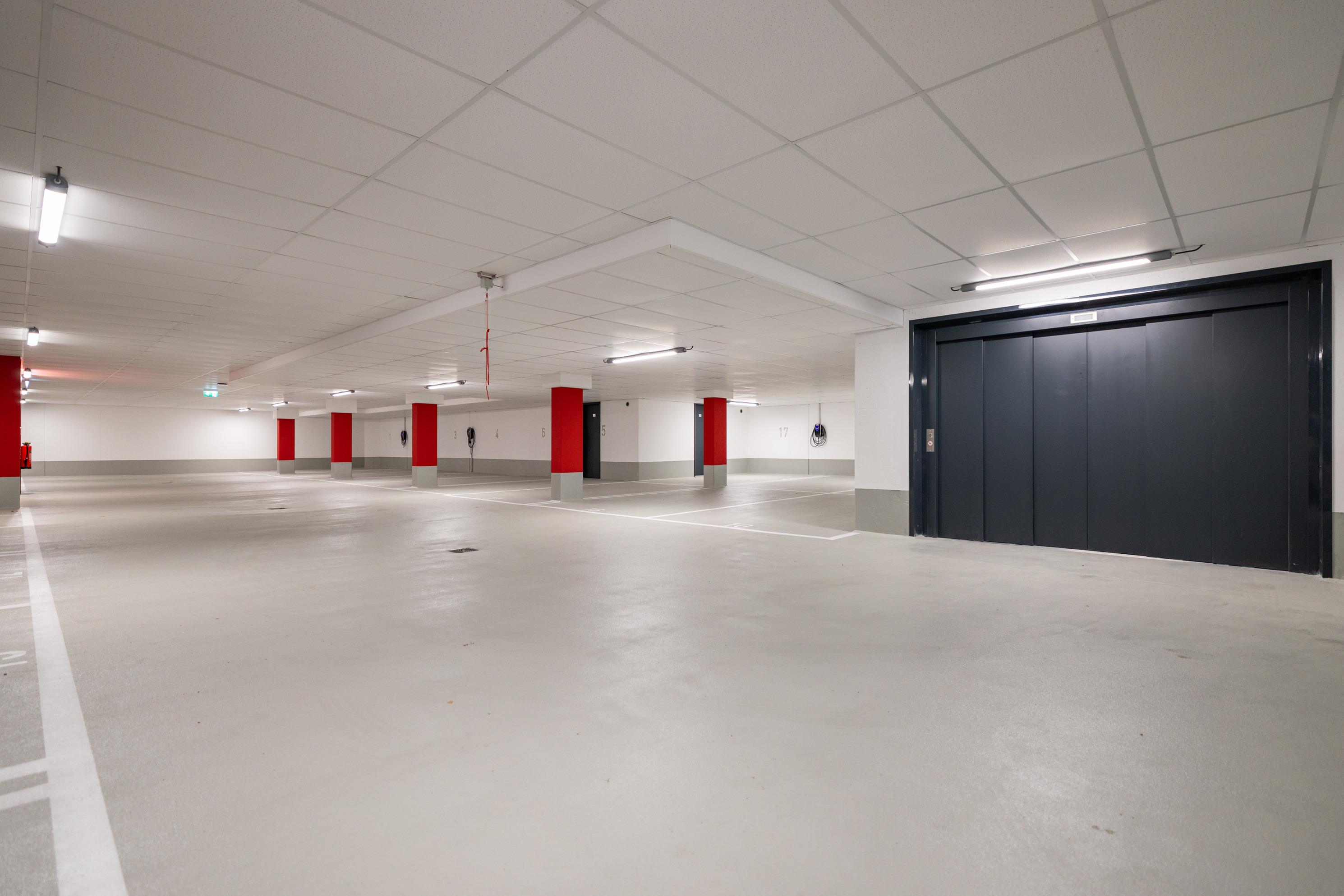 Einen privaten Tiefgaragenstellplatz mit Ladestation, bequem erreichbar über Autoaufzug