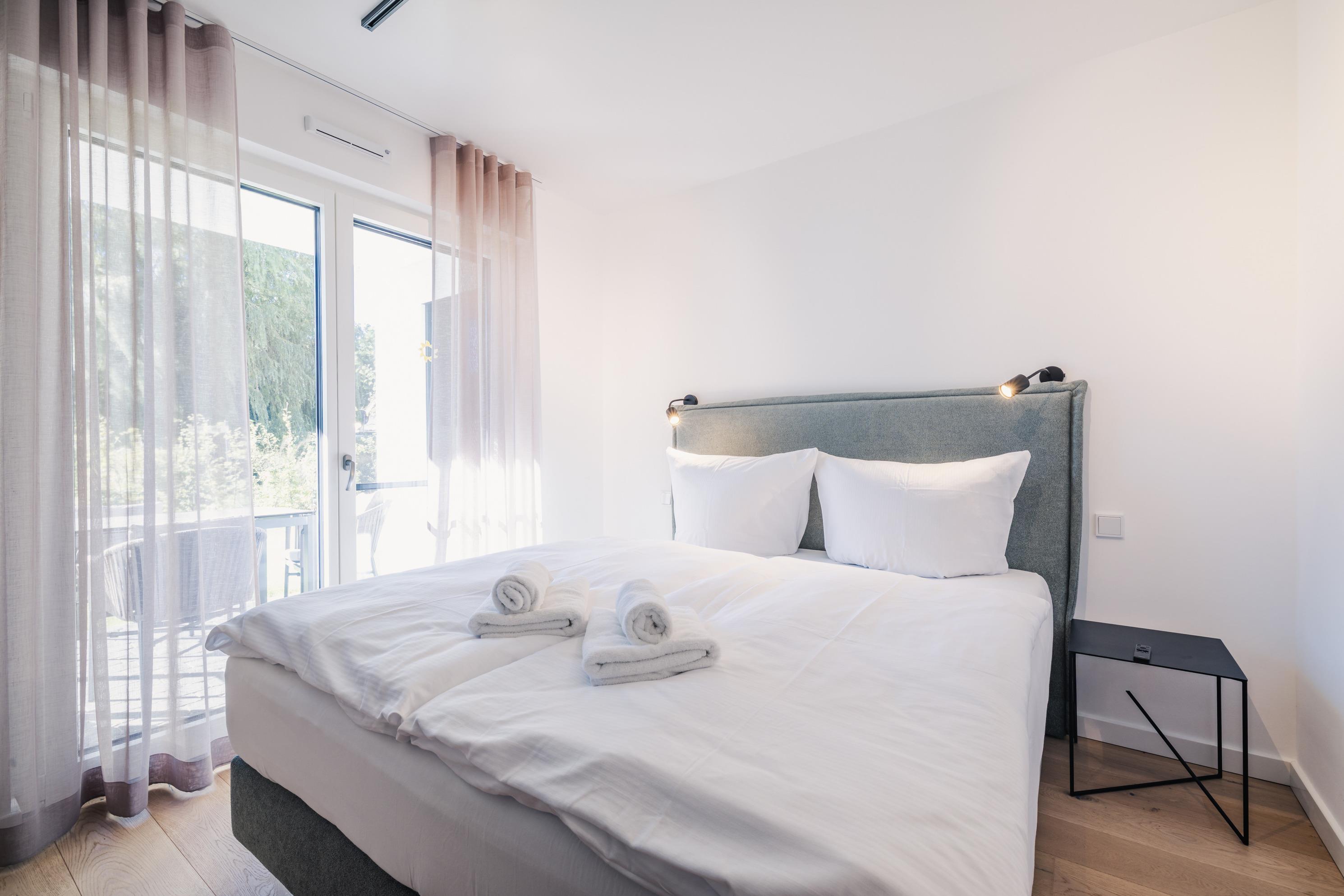 Zwei einladende Schlafzimmer, jeweils mit direktem Zugang zur Terrasse und zum Garten – perfekt für entspannte Momente im Freien.