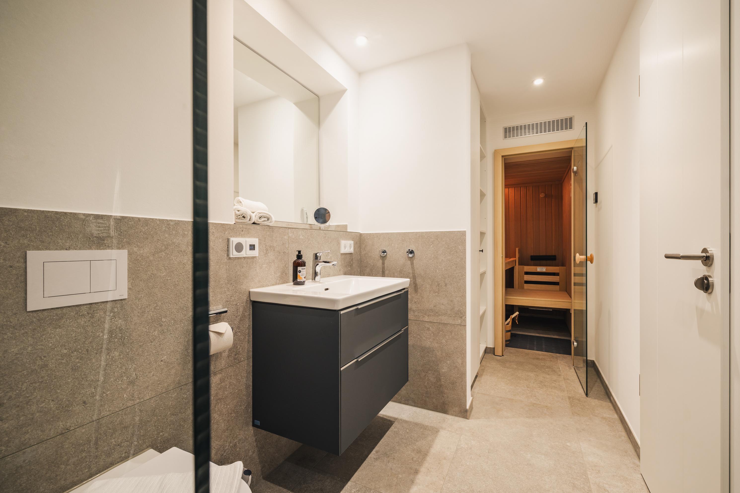 Modernes Bad mit ebenerdiger Dusche und Zugang zur privaten Sauna