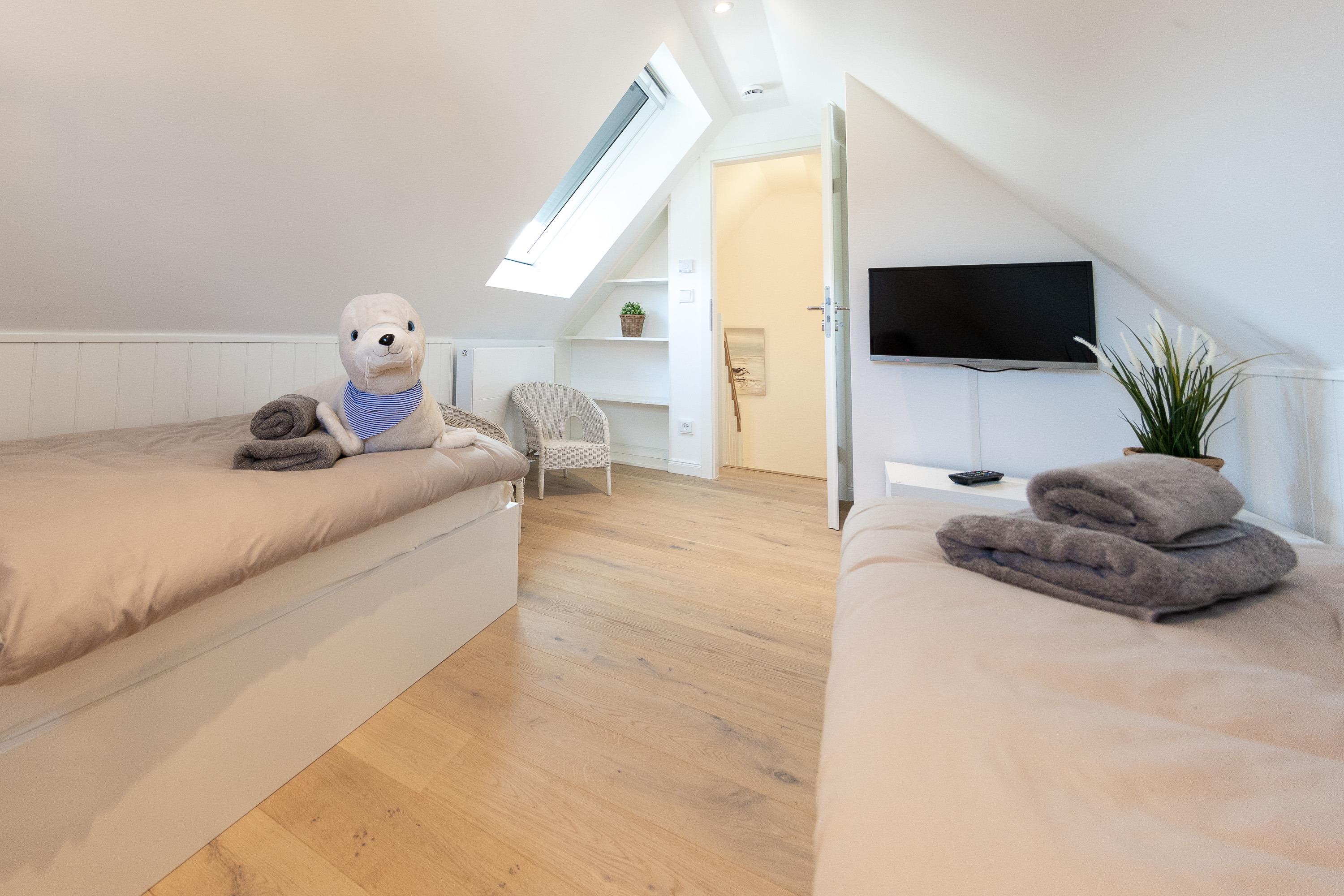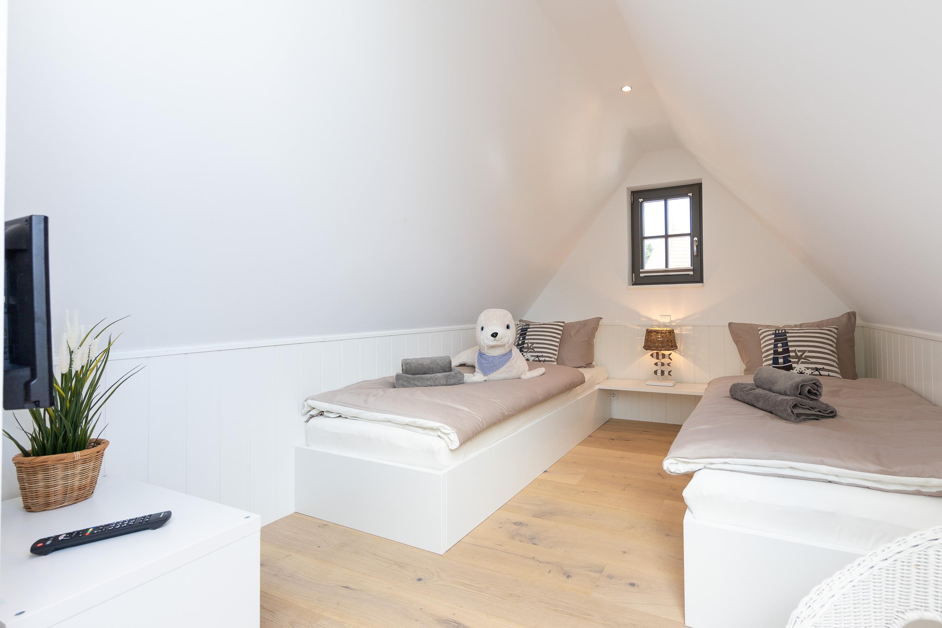 Hinweis: Die Betten sind bei Ihrer Anreise stets frisch bezogen. Bitte beachten Sie, dass grundsätzlich immer nur so viele Betten bezogen werden, wie Personen anreisen. Da das Haus über zwei Doppelbetten und zwei Einzelbetten verfügt, werden bei einer Buchung von vier Personen standardmäßig die beiden Doppelbetten vorbereitet, gleiches gilt auch bei zwei Personen, da wird nur ein Doppelbett bezogen. Wir gehen davon aus, dass gemeinsam reisende Personen ein Doppelbett teilen. Sollten Sie eine andere Schlafaufteilung wünschen, teilen Sie uns dies bitte vor Ihrer Anreise mit, damit wir die Betten entsprechend vorbereiten können. Eine Einsicht in das persönliche Verhältnis der Reisenden besteht selbstverständlich nicht.
