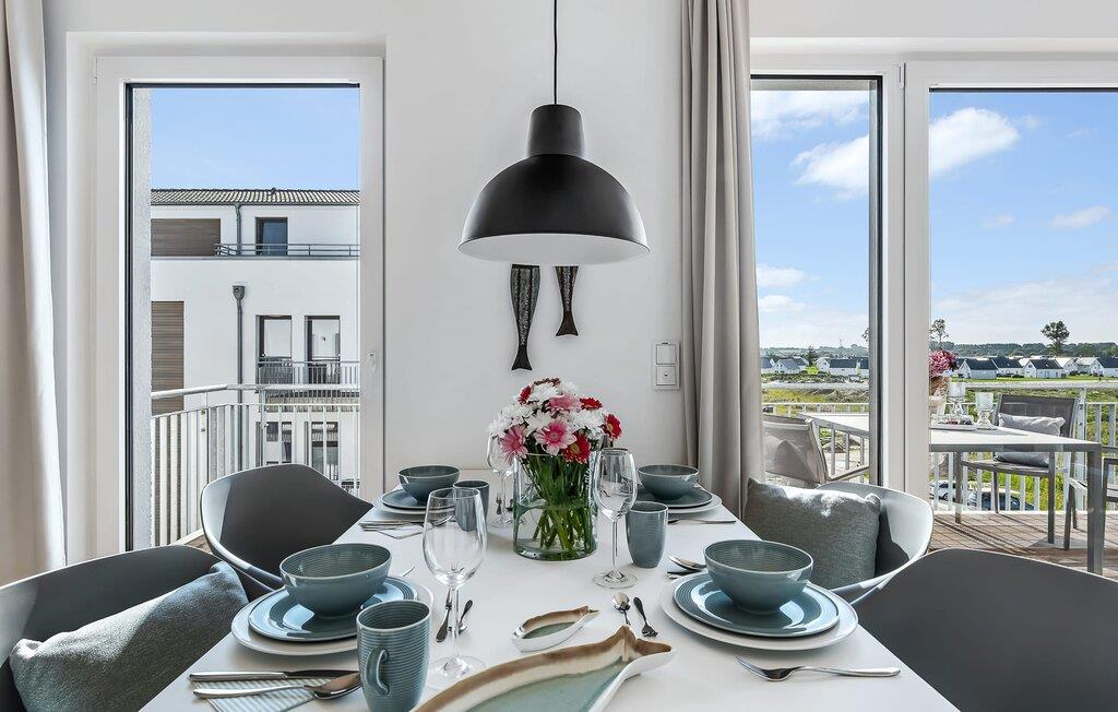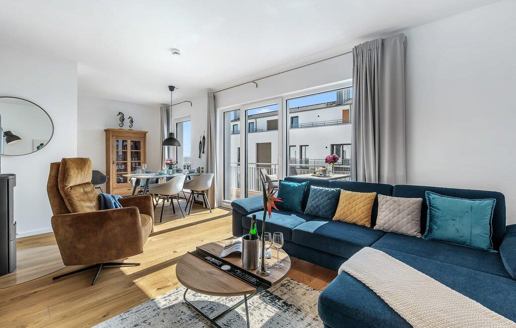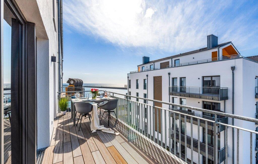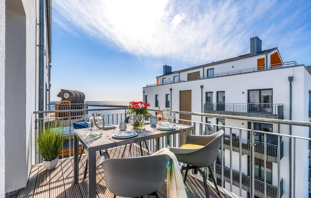 OSTSEEGLÜCK besticht durch den großzügigen Wohn- und Essbereich mit seinen bodentiefen Fenstern und dem angrenzenden Balkon, der mit Gartenmöbeln gut bestuhlt ist und zum Entspannen einlädt.