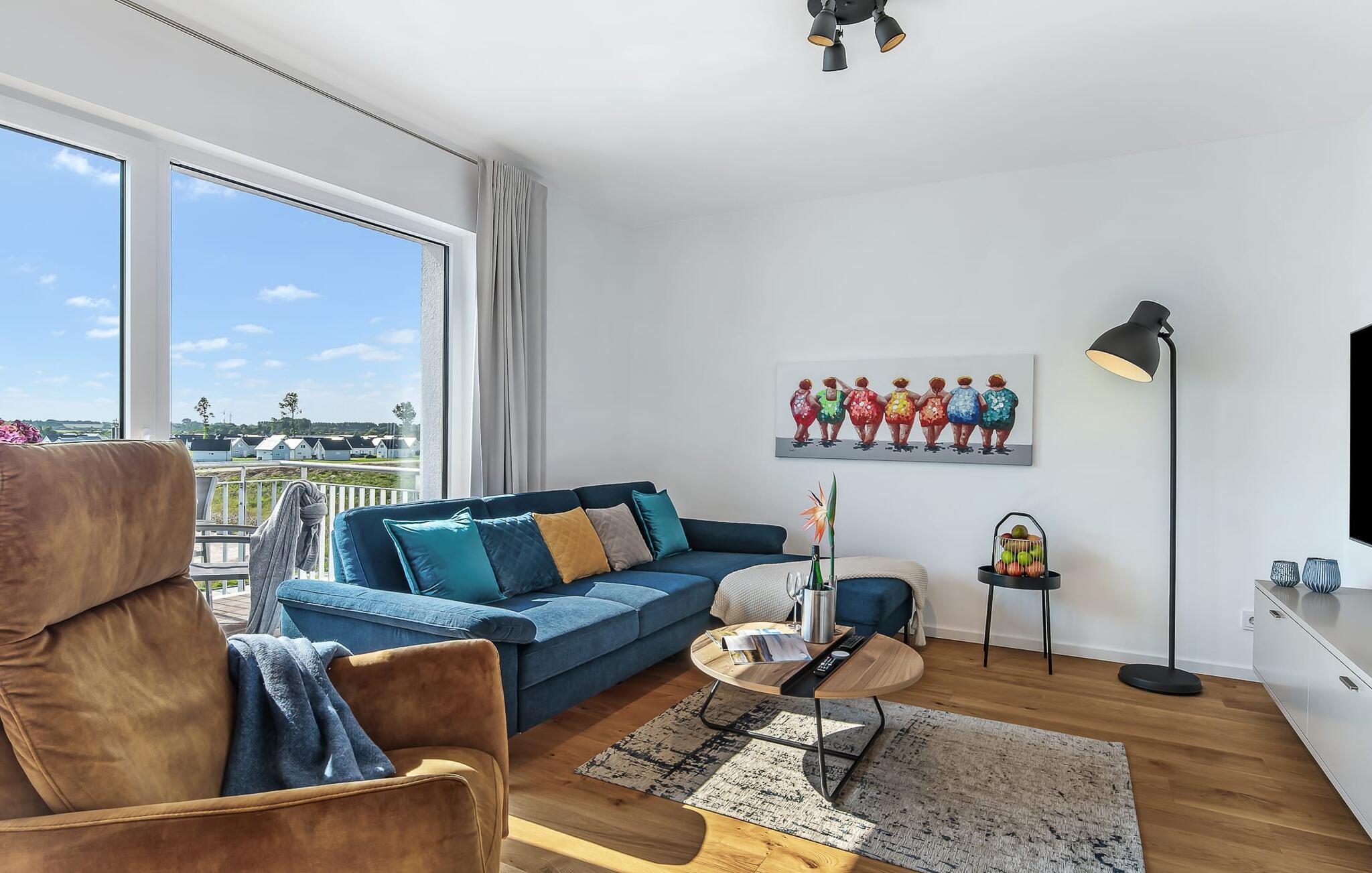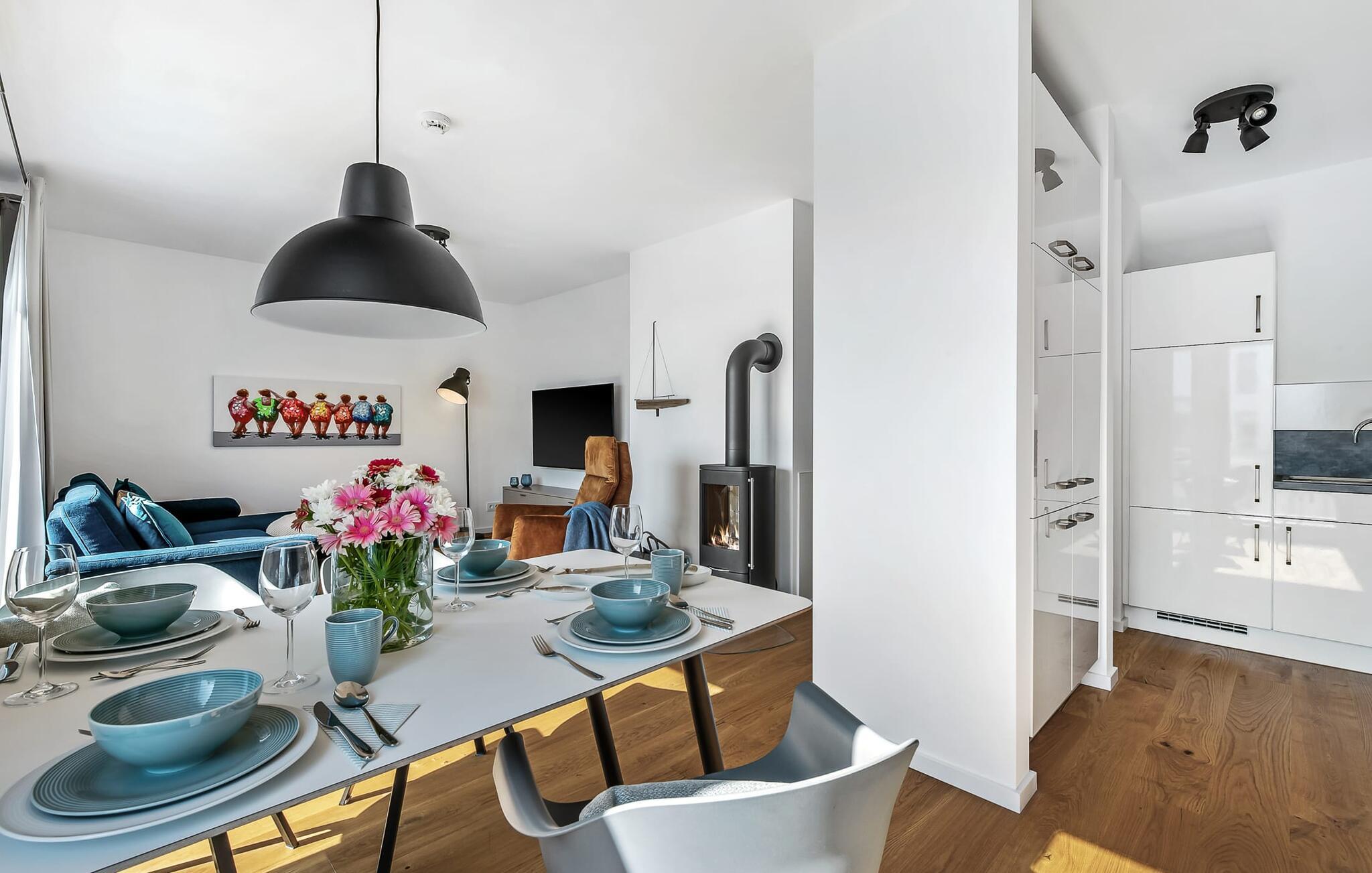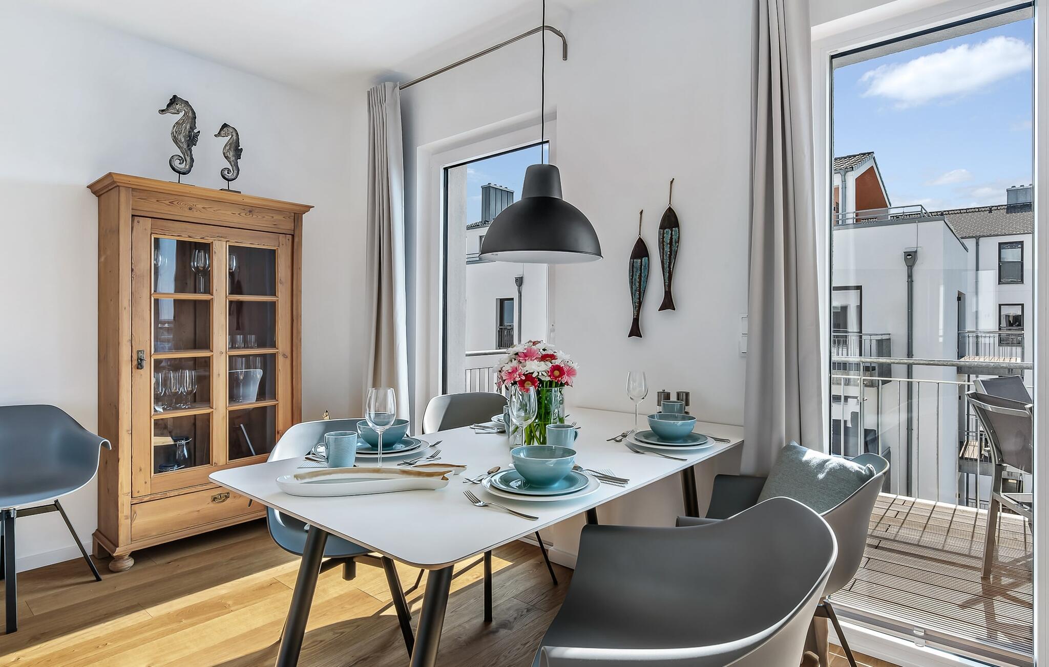 OSTSEEGLÜCK besticht durch den großzügigen Wohn- und Essbereich mit seinen bodentiefen Fenstern und dem angrenzenden Balkon, der mit Gartenmöbeln gut bestuhlt ist und zum Entspannen einlädt.