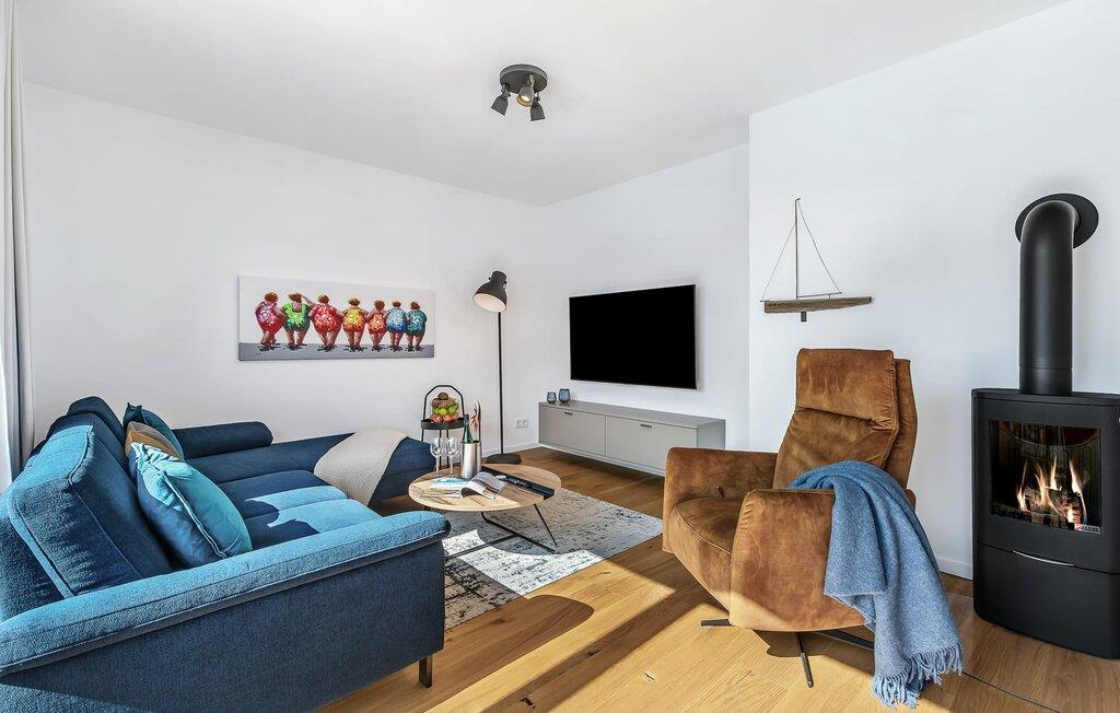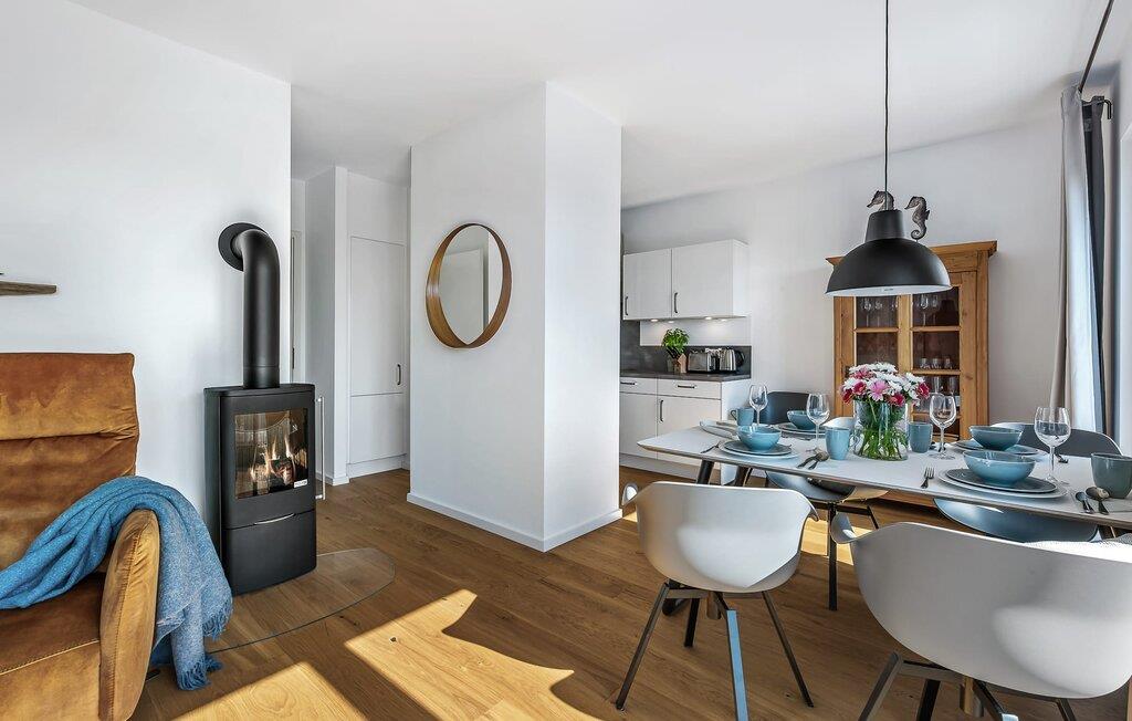 Großzügige Ferienwohnung Ostseeglück nahe Weidefelder Strand mit Balkon, Kaminofen und moderner Küche für erholsame Ostseeurlaube.