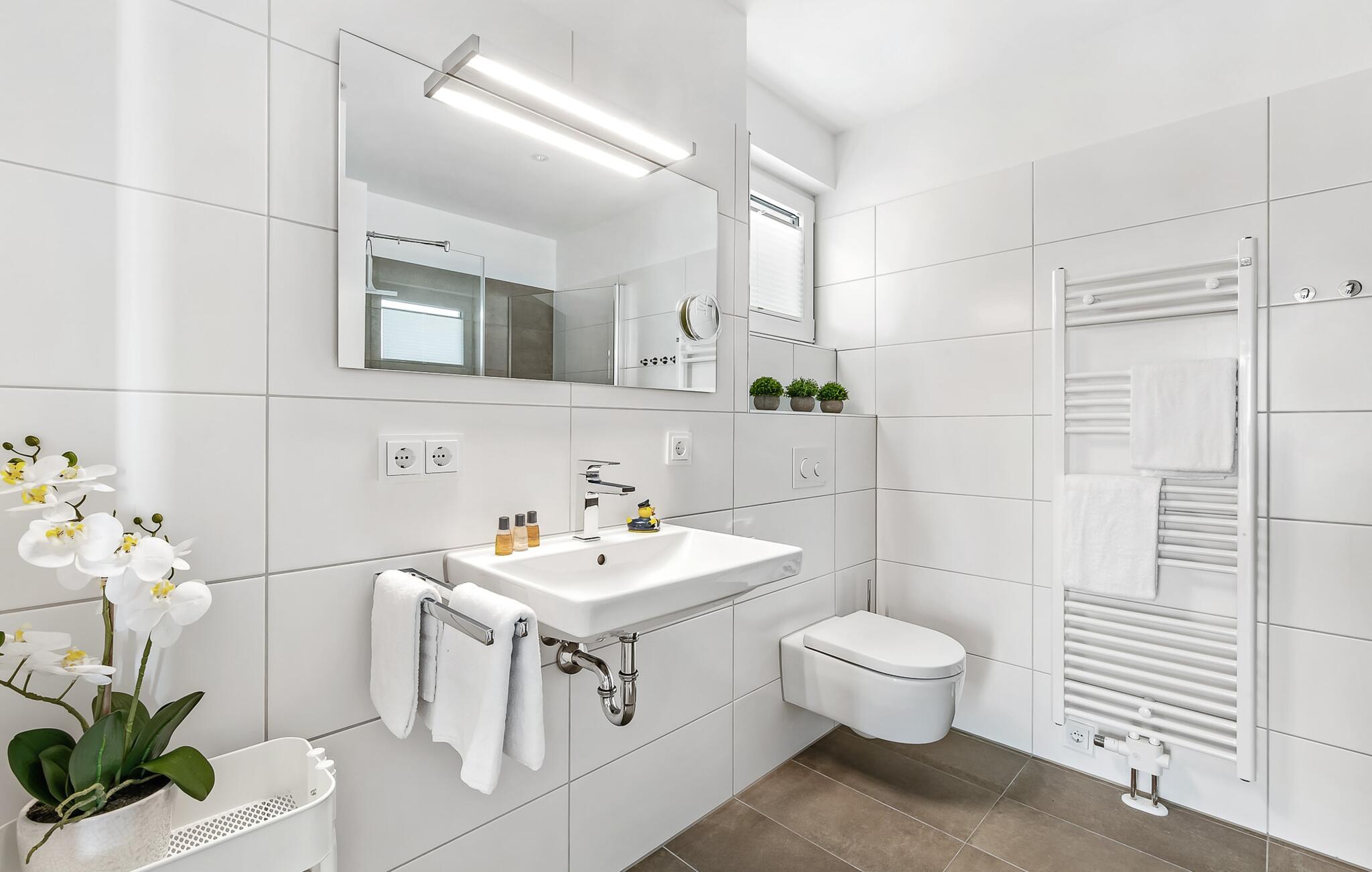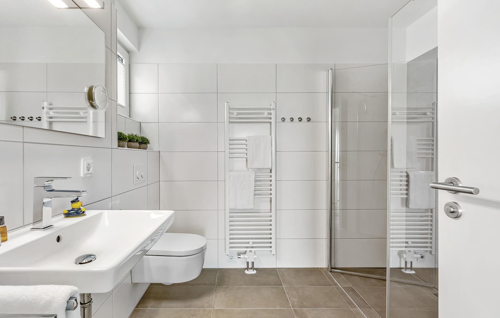 Das Bad mit der bodengleichen Dusche bietet reichlich Platz und alles, was man für den Start in einen neuen Tag benötigt.