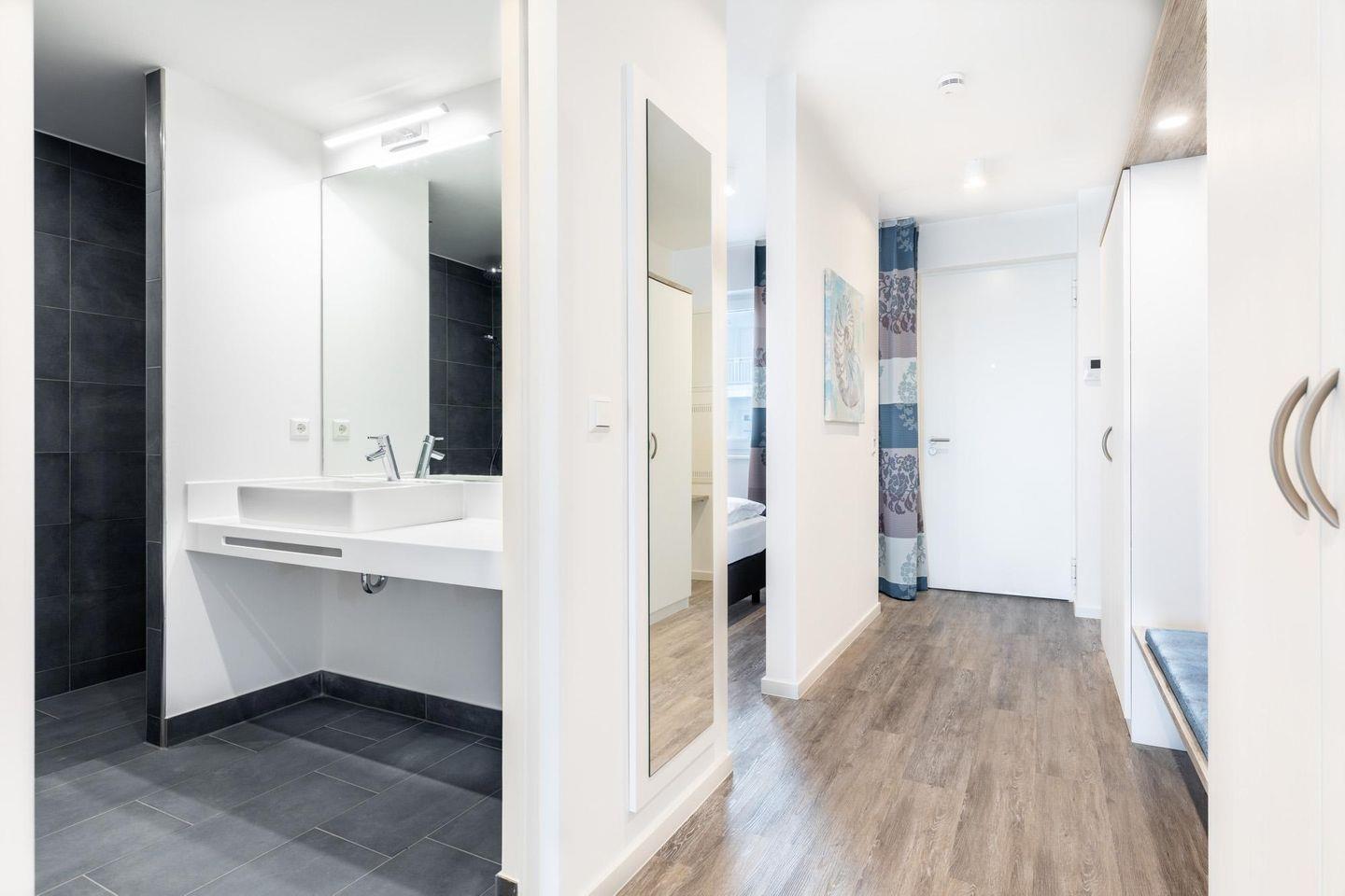 Im Foyer mit Rezeption heißen wir euch herzlich willkommen und stehen euch während eures Aufenthaltes bei Fragen gern zur Seite. Auf Wunsch nutzt ihr ganz nach Belieben, die attraktiven Annehmlichkeiten der Apartmentanlage Meerblickvilla - im Erdgeschoss befindet sich ein moderner Saunabereich mit finnischer Sauna, Biosauna und Ruheraum.