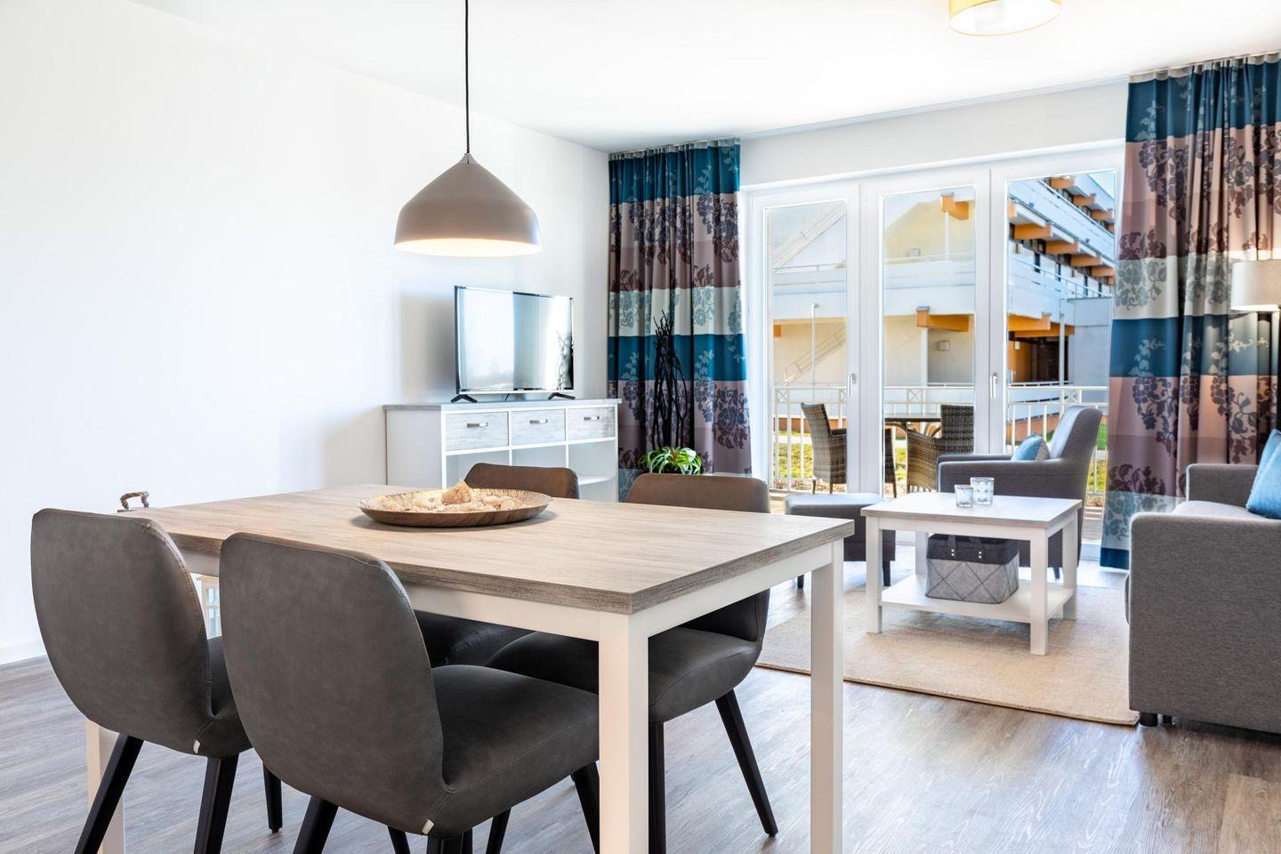 Das 58 m² große 2-Zimmer Apartment ist für bis zu 4 Personen geeignet. Besonders hervorzuheben ist der sonnige und überdachte Balkon in West-Lage; hier genießen Sie das wohltuende Meeresklima. Auch Ihr Vierbeiner ist hier herzlich willkommen!