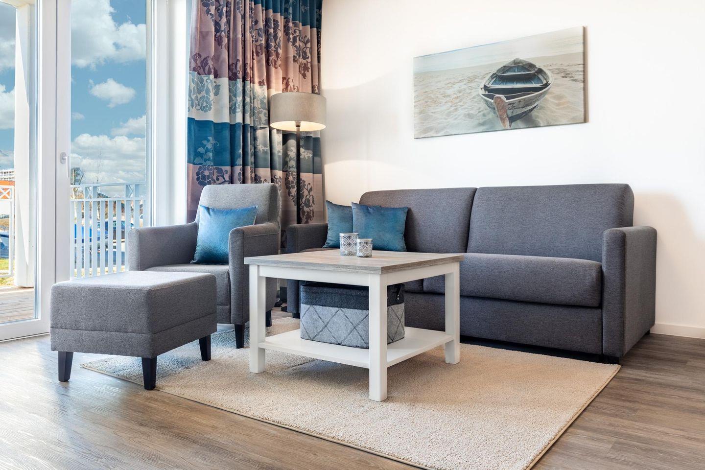 Im modern-behaglichen Wohn-Essbereich befindet sich eine Doppelschlafcouch (1,60 x 1,95 m) und ein großer Flatscreen-TV (43 Zoll). Der moderne Schlafbereich mit seinem offenen Wohnkonzept bietet hohen Schlafkomfort durch zwei Boxspringbetten (0,90 x 2,00 m) und ist mit einem weiteren Flatscreen-TV (40 Zoll) sowie Kleiderschrank und Sitz-/Kofferbank ausgestattet. Das stilvolle Badezimmer verfügt über eine ebenerdige Regendusche, WC, Waschtisch mit Föhn, Handtuchheizkörper und Fußbodenheizung.