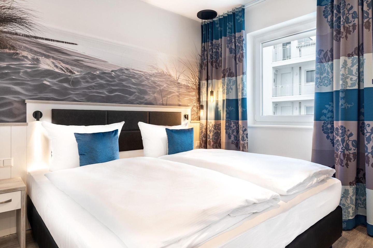 Das 58 m² große 2-Zimmer Apartment ist für bis zu 4 Personen geeignet. Besonders hervorzuheben ist der sonnige und überdachte Balkon in West-Lage; hier genießt ihr das wohltuende Meeresklima. Auch euer Vierbeiner ist hier herzlich willkommen!