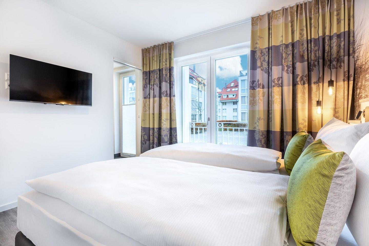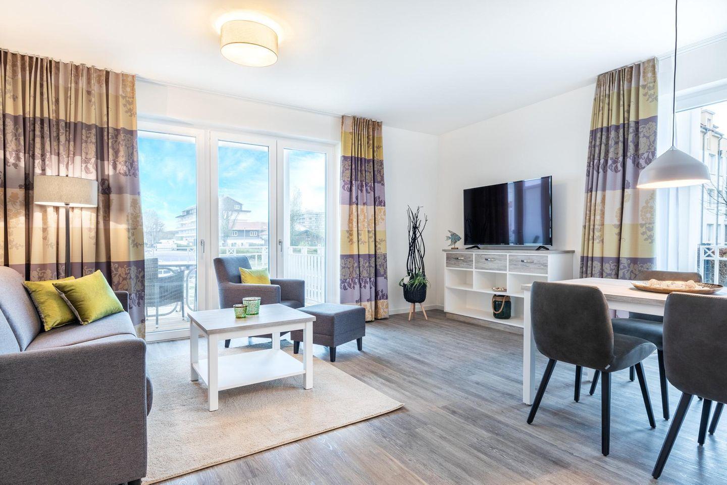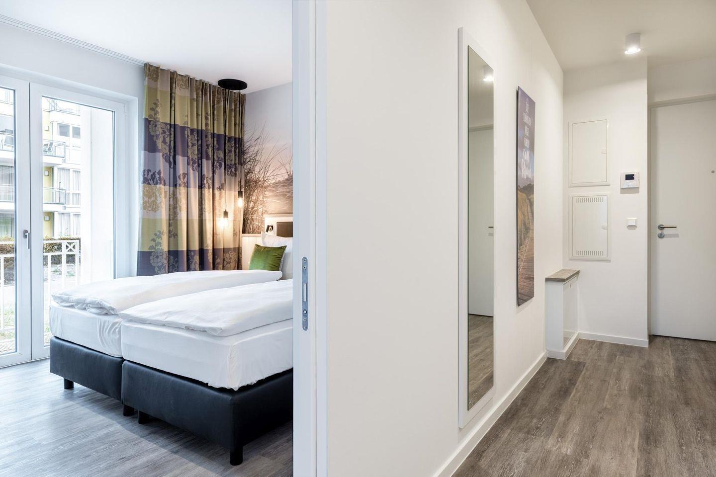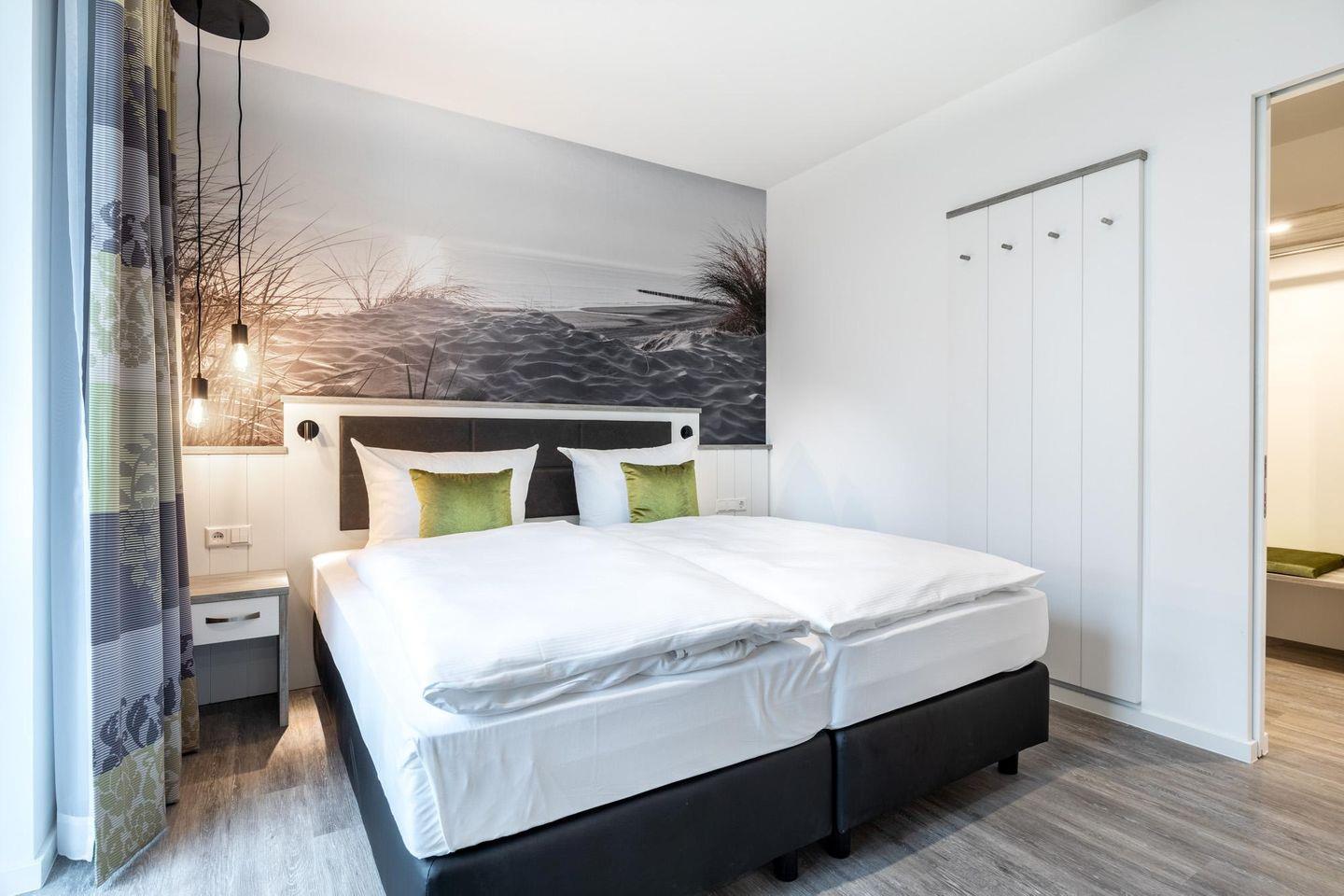 Im modern-behaglichen Wohn-Essbereich befindet sich eine Doppelschlafcouch (1,60 x 1,95 m) und ein großer Flatscreen-TV (55 Zoll). Das separate, nach Nordwesten gelegene Schlafzimmer bietet hohen Schlafkomfort durch zwei moderne Boxspringbetten (0,90 x 2,00 m) und ist mit einem weiteren Flatscreen-TV (40 Zoll) ausgestattet. Im Flur befinden sich Kleiderschrank und Sitz-/Kofferbank. Das stilvolle Badezimmer verfügt über eine ebenerdige Regendusche, WC, Waschtisch mit Föhn, Handtuchheizkörper und Fußbodenheizung und ist mit dem benachbarten Schlafzimmer direkt verbunden.
