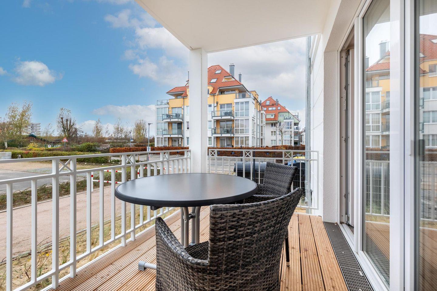 Entspannte und sonnige Stunden mit seitlichem Blick auf die Ostsee verbringt ihr auf dem überdachten und mit Gartenmöbeln ausgestatteten Balkon in Süd-West-Lage. Der Balkon ist vom Wohnbereich aus zugänglich. Ein Kinderbett kann gegen Entgelt im Wohnbereich aufgestellt werden und auf Wunsch könnt ihr einen Hochstuhl hinzubuchen. Haustiere sind herzlich willkommen.