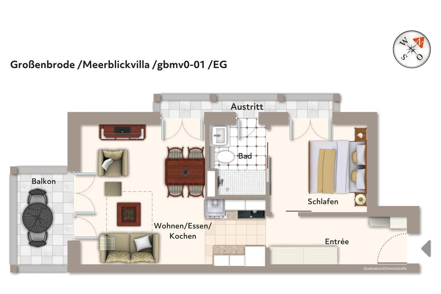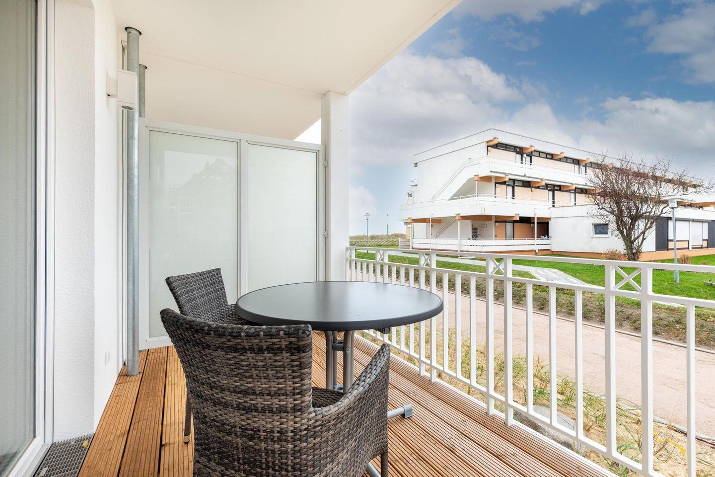 Das 55 m² große 2-Zimmer Apartment ist für bis zu 4 Personen geeignet. Besonders hervorzuheben ist der sonnige, überdachte Balkon in Süd-West-Lage; hier genießen Sie das wohltuende Meeresklima. Durch einen über die nordwestliche Seite verlaufenden Austritt - ähnlich einem französischen Balkon - ist das Apartment besonders lichtdurchflutet.