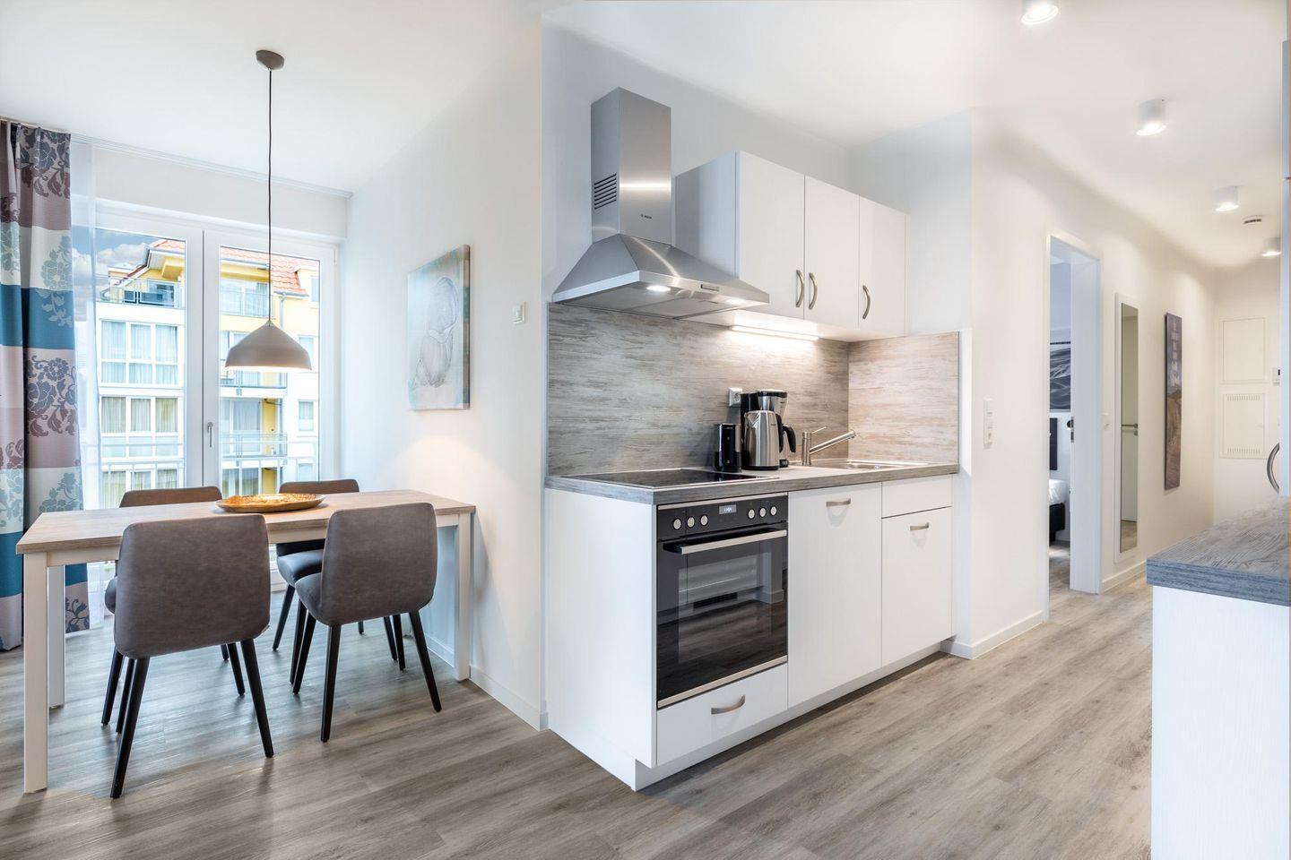 Das lichtdurchflutete und familienfreundliche Nichtraucher-Apartment ist barrierearm und verfügt über Fußbodenheizung, sonnenschutzverglaste und bodentiefe Fensterflächen, kostenfreies WLAN und eine voll ausgestattete offene Küche mit Geschirrspüler, Kühlschrank und Gefrierfach, Kaffeemaschine, Toaster, Wasserkocher, Herd mit Glaskeramikkochfeld und Backofen.