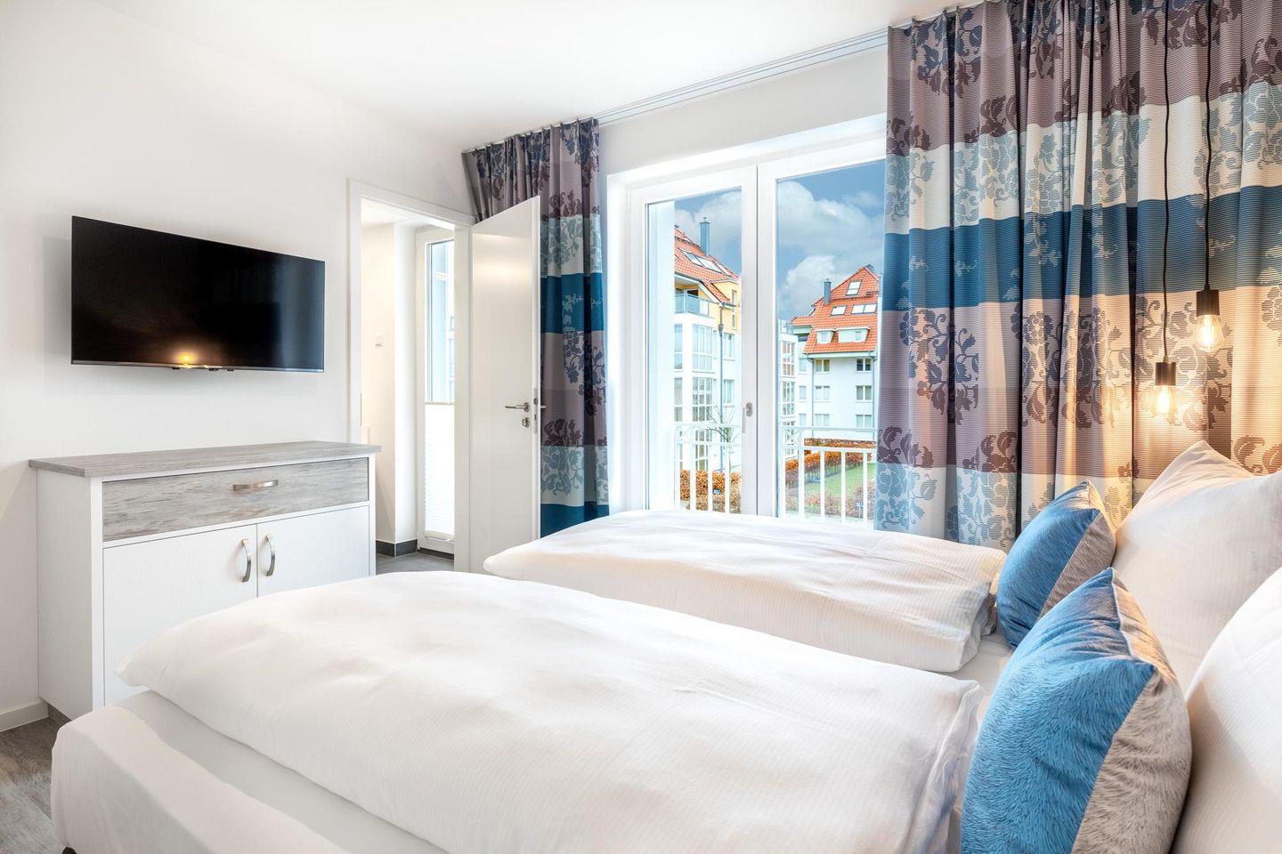 Das 55 m² große 2-Zimmer Apartment ist für bis zu 4 Personen geeignet. Besonders hervorzuheben ist der sonnige und überdachte Balkon in Süd-West-Lage; hier genießen das wohltuende Meeresklima. Durch einen über die nordwestliche Seite verlaufenden Austritt – ähnlich einem französischen Balkon - ist das Apartment besonders lichtdurchflutet.