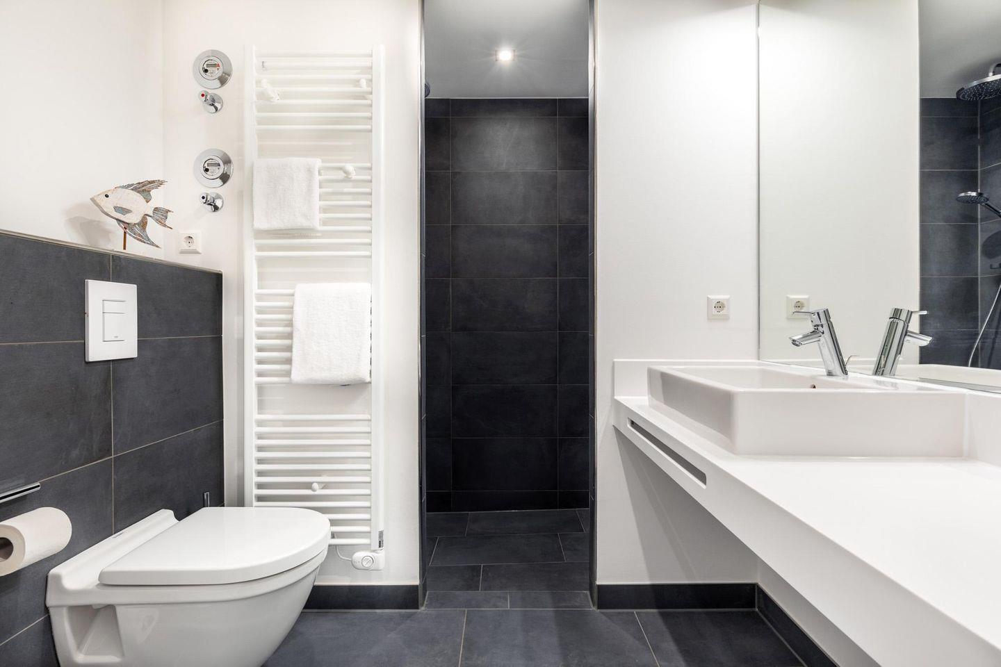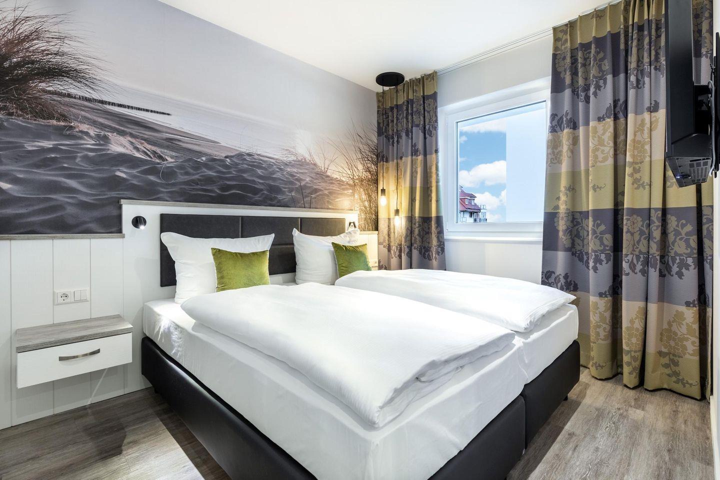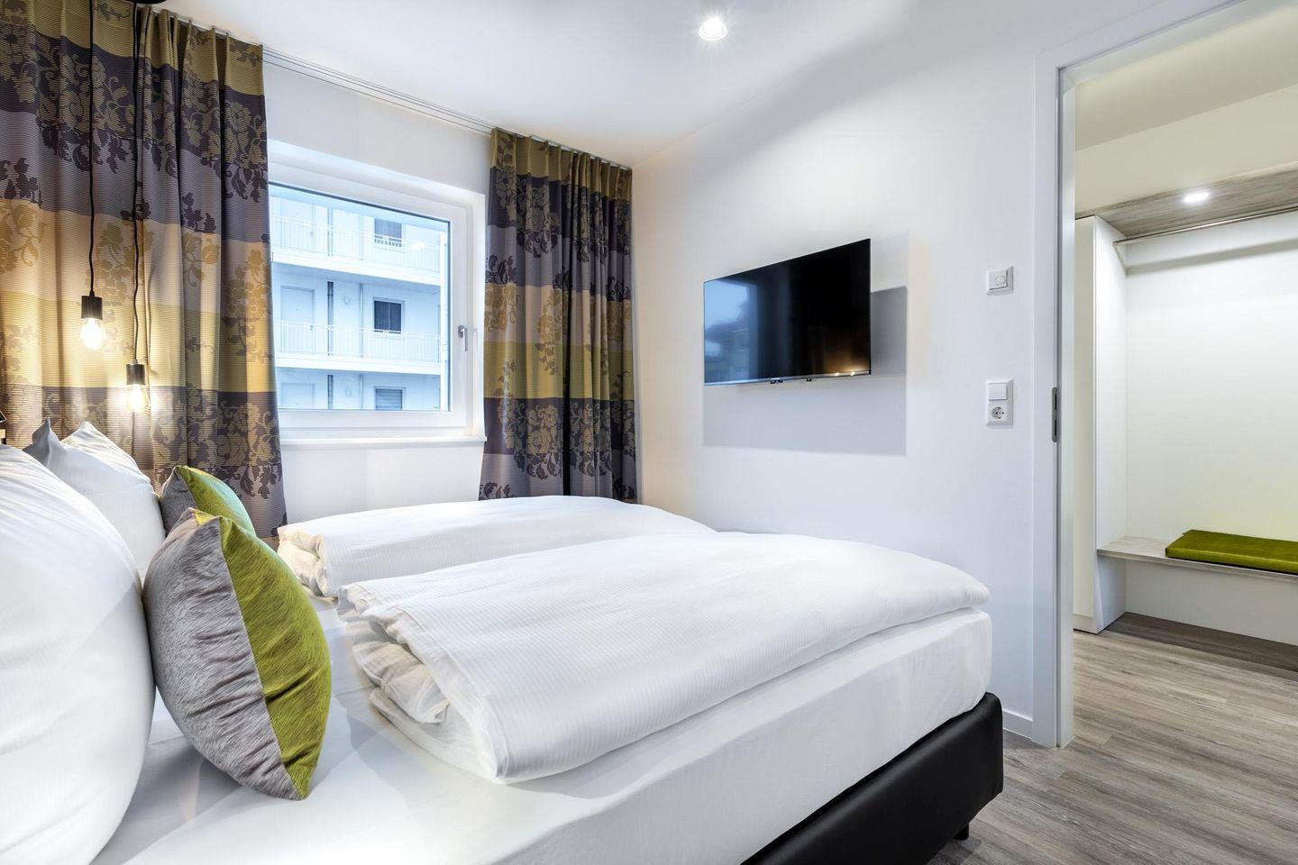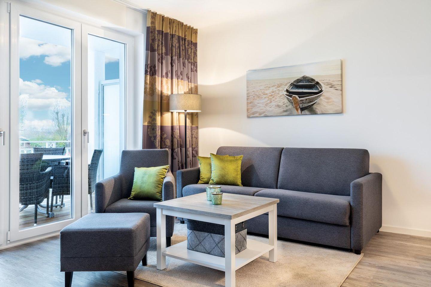 Im modern-behaglichen Wohn-Essbereich befindet sich eine Doppelschlafcouch (1,60 x 1,95 m) und ein großer Flatscreen-TV (43 Zoll). Das separate Schlafzimmer bietet hohen Schlafkomfort durch zwei moderne Boxspringbetten (0,90 x 2,00 m) und ist mit einem weiteren Flatscreen-TV (40 Zoll) sowie Kleiderschrank und Sitz-/Kofferbank ausgestattet. Das stilvolle Badezimmer verfügt über eine ebenerdige Regendusche, WC, Waschtisch mit Föhn, Handtuchheizkörper und Fußbodenheizung.