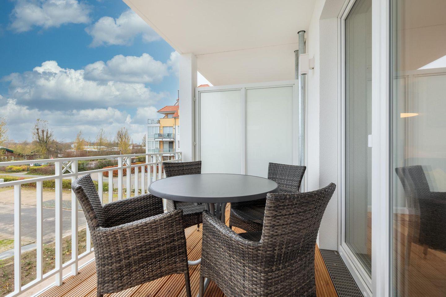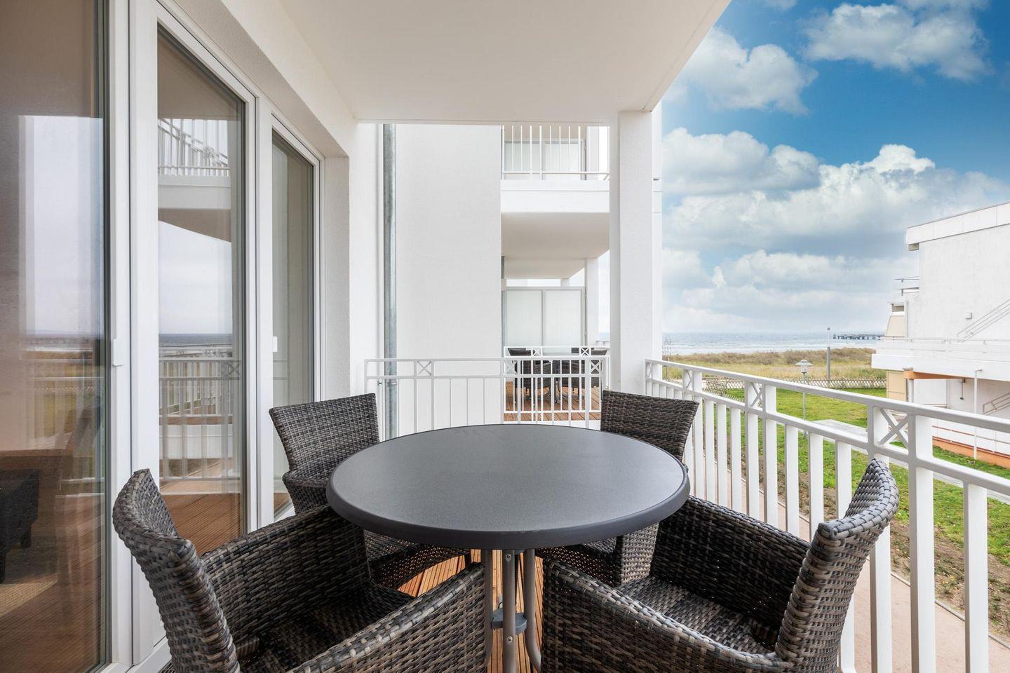 Entspannte und sonnige Stunden mit seitlichem Blick auf die Ostsee verbringt ihr auf dem überdachten und mit Gartenmöbeln ausgestatteten Balkon in West-Lage. Der Balkon ist vom Wohnbereich aus zugänglich.