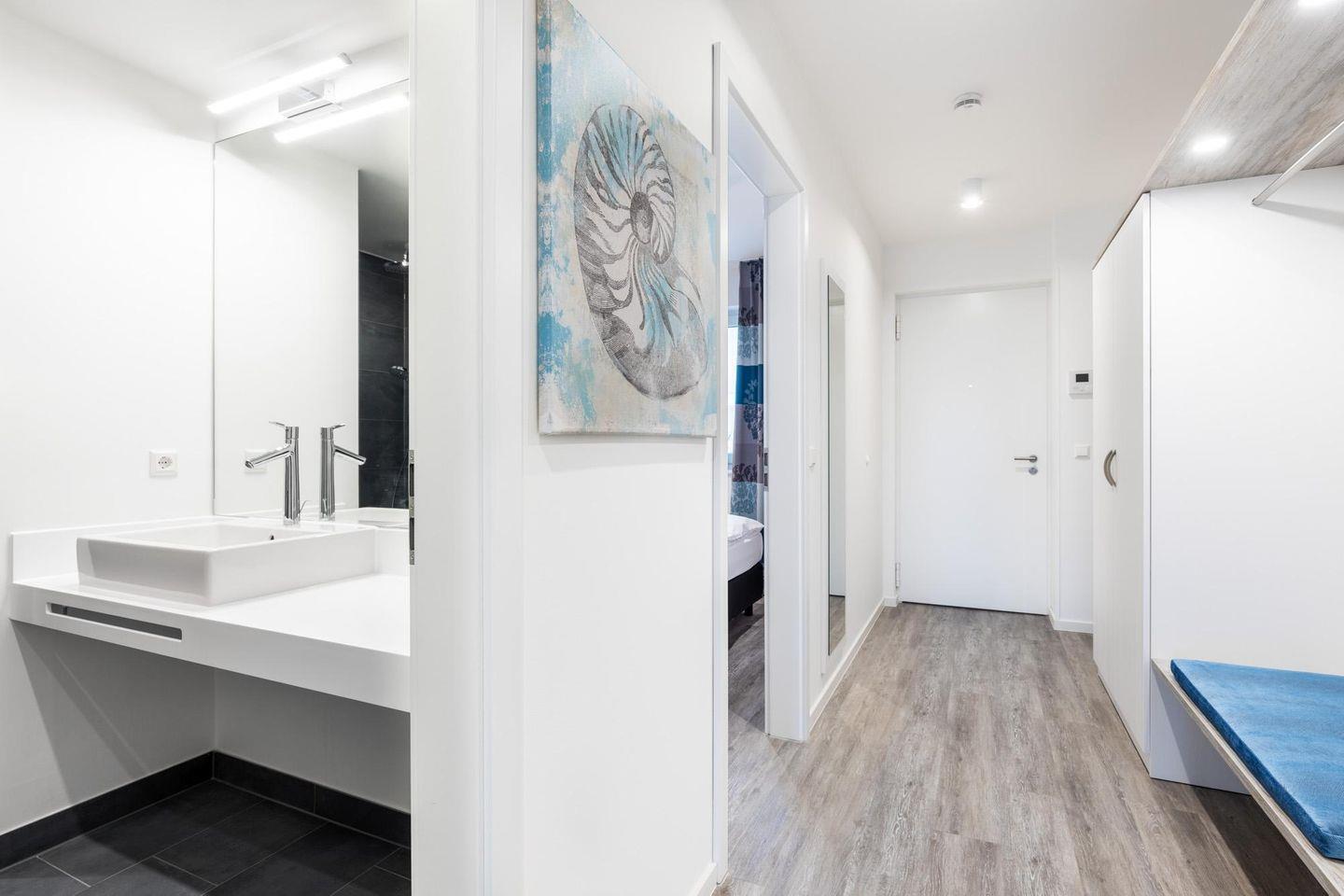 Das lichtdurchflutete und familienfreundliche Nichtraucher-Apartment ist barrierearm und verfügt über Fußbodenheizung, sonnenschutzverglaste und bodentiefe Fensterflächen, kostenfreies WLAN und eine voll ausgestattete offene Küche mit Geschirrspüler, Kühlschrank und Gefrierfach, Kaffeefilter- und Kaffeekapselmaschine (Nespresso), Toaster, Wasserkocher, Eierkocher, Herd mit Glaskeramikkochfeld und Backofen.