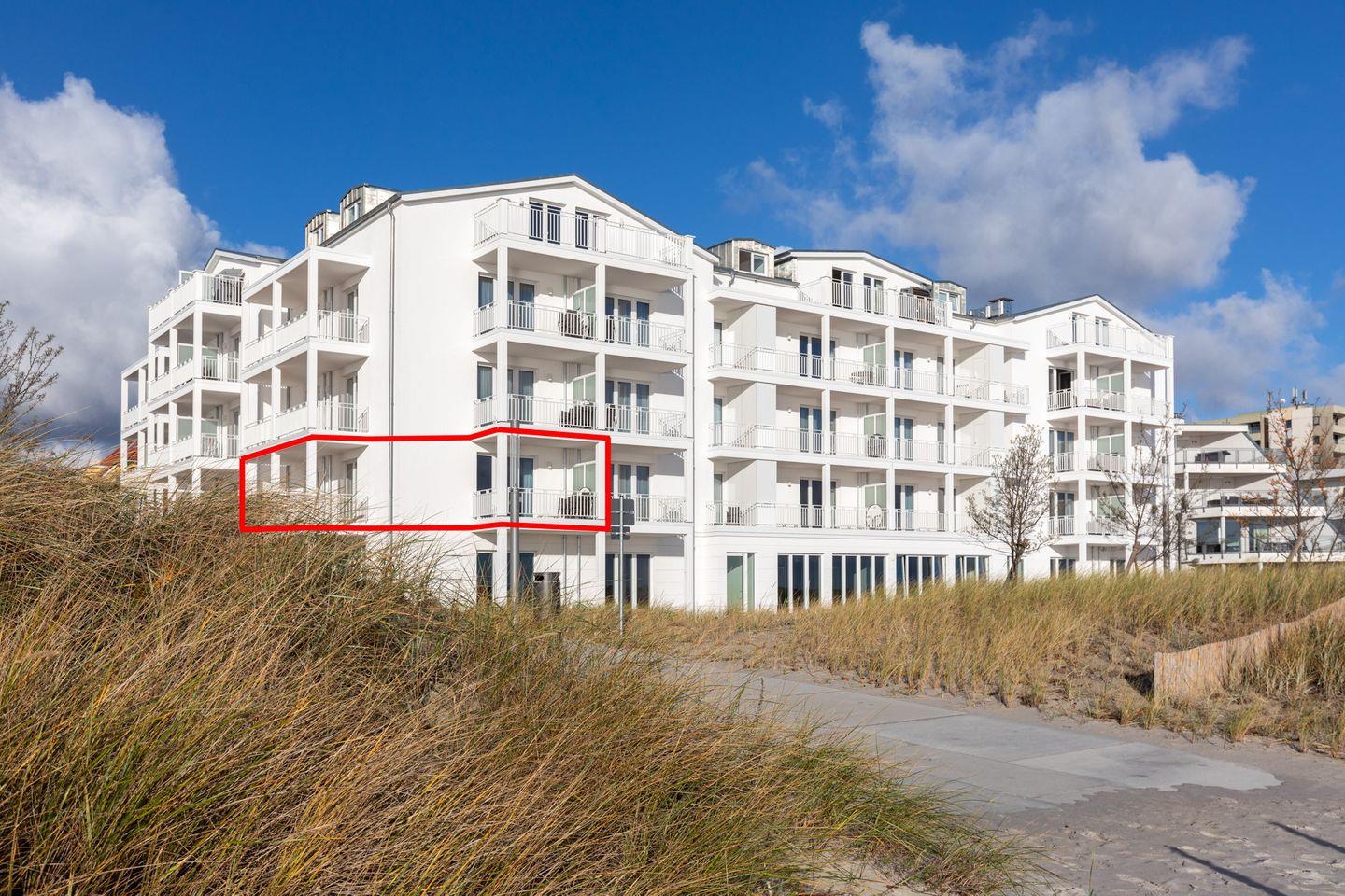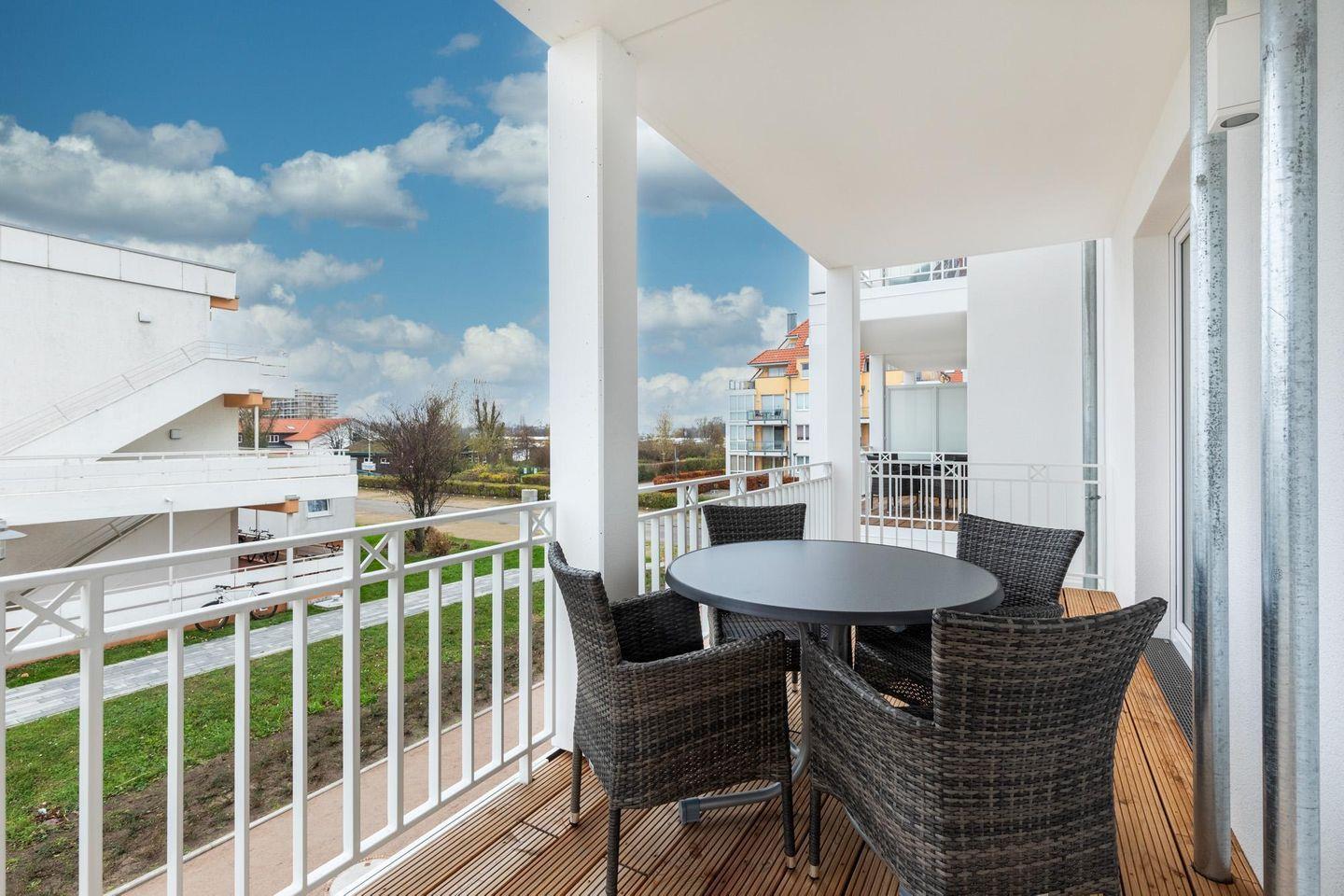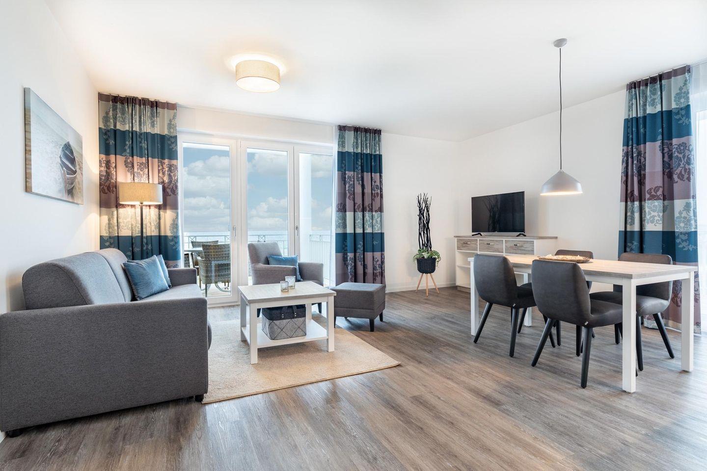 Das 68 m² große 2-Zimmer Apartment ist für bis zu 4 Personen geeignet. Das großzügige Apartment verfügt über gleich zwei sonnige und überdachte Balkone in Süd-Ost- bzw. in Süd-West-Lage; Von hier aus genießt ihr einen einmaligen Blick auf die Ostsee und erlebt das wohltuende Meeresklima.